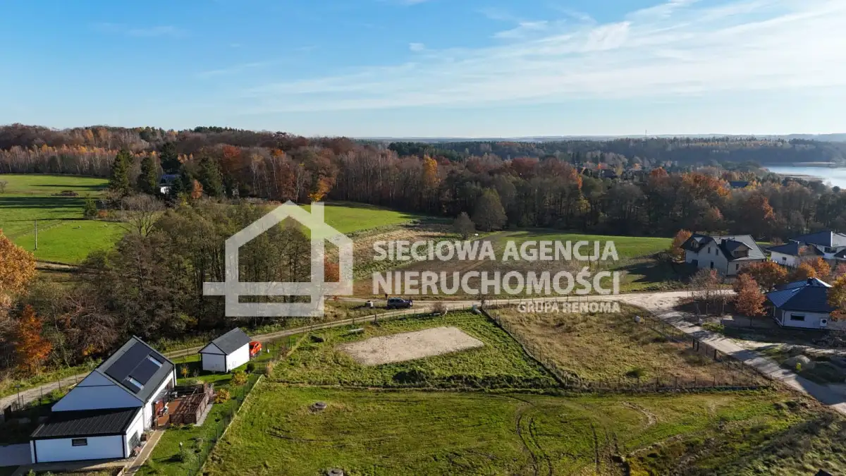 Działka leży w spokojnej i malowniczej okolicy w sąsiedztwie jeziora