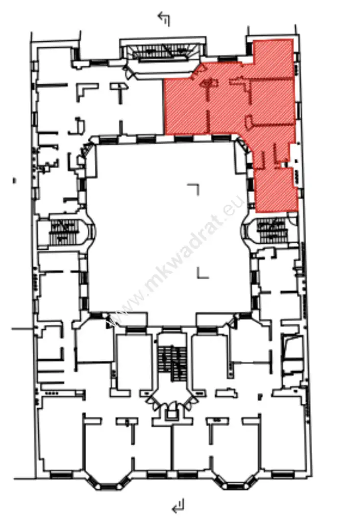 The rooms are unfurnished, which allows for any arrangement according to the needs of the tenant. The height of the rooms is 3.50 m, and the windows overlook the quiet, green courtyard of the building.