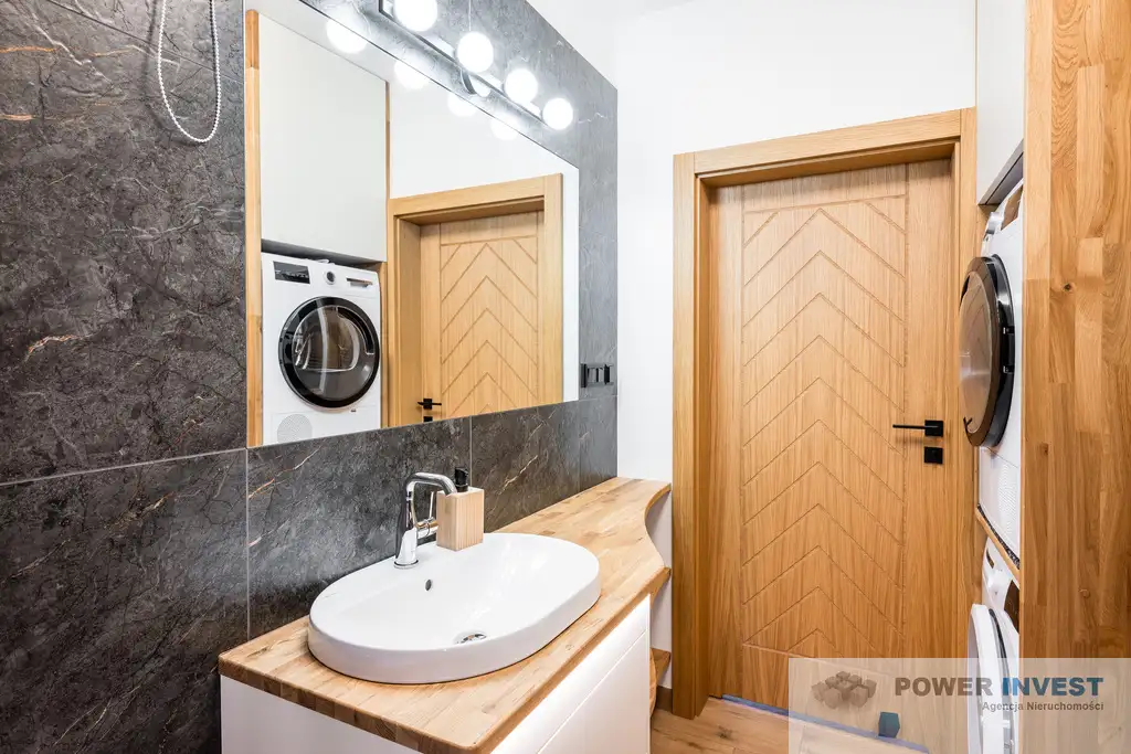 Wszystkie meble w kuchni, łazience i garderobie zostały wykonane na wymiar z użyciem wysokiej jakości materiałów: