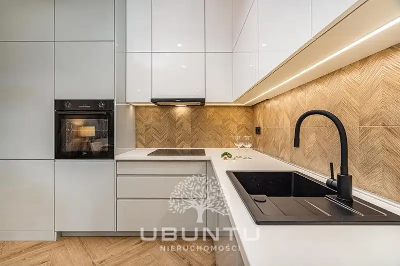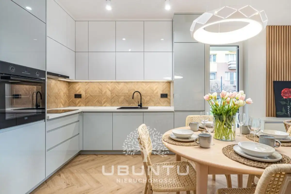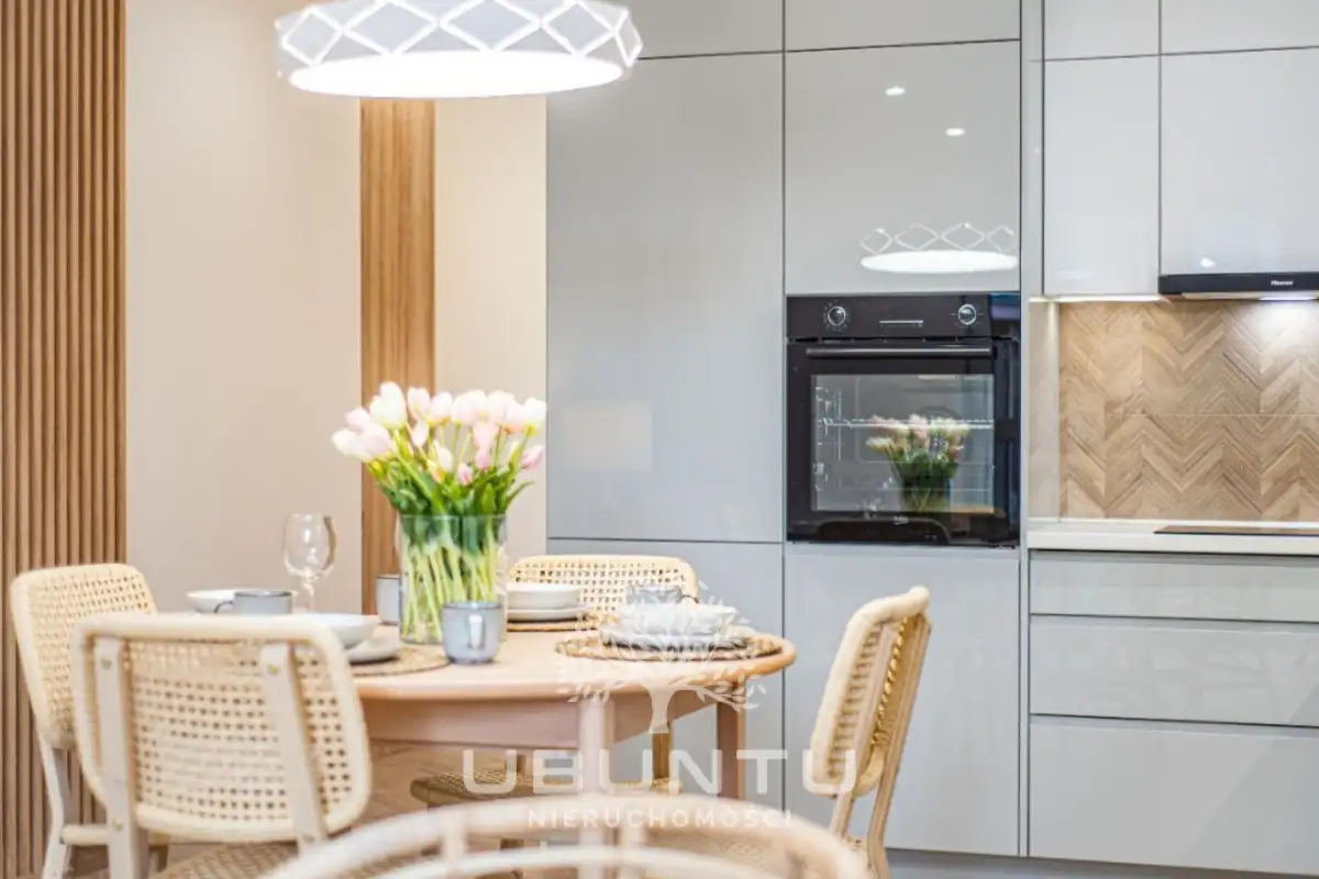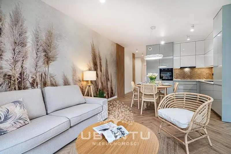 Przestronny salon z aneksem kuchennym, w pełni wyposażony w meble oraz wysokiej klasy sprzęt AGD (piekarnik, płyta indukcyjna),