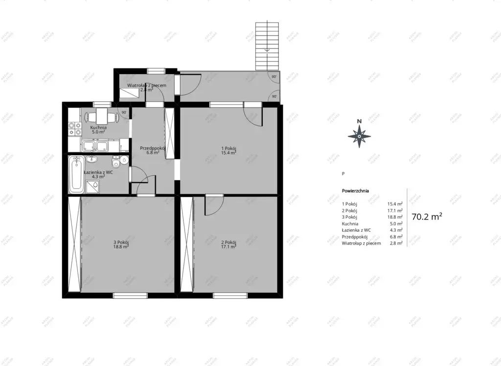 -3 duże pokoje o powierzchniach: 18,8, 17,1 i 15,4 m²,