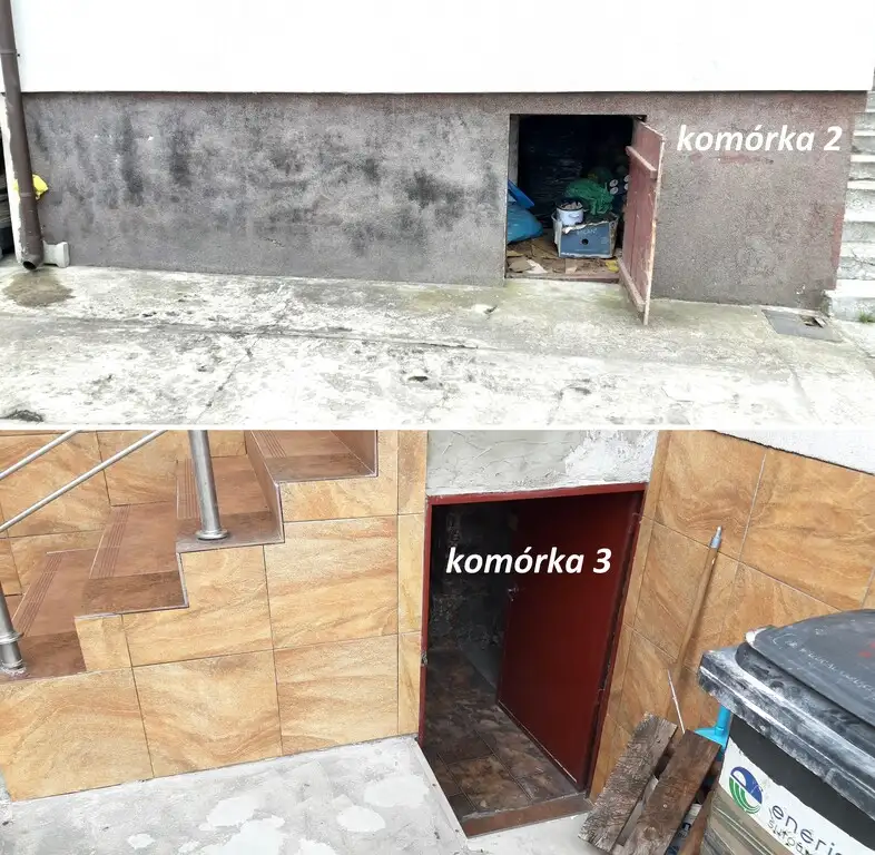 Do sprzedawanego lokalu należą 2 komórki: 1. pod schodami wejściowymi, 2. niska, pod cokołem budynku.