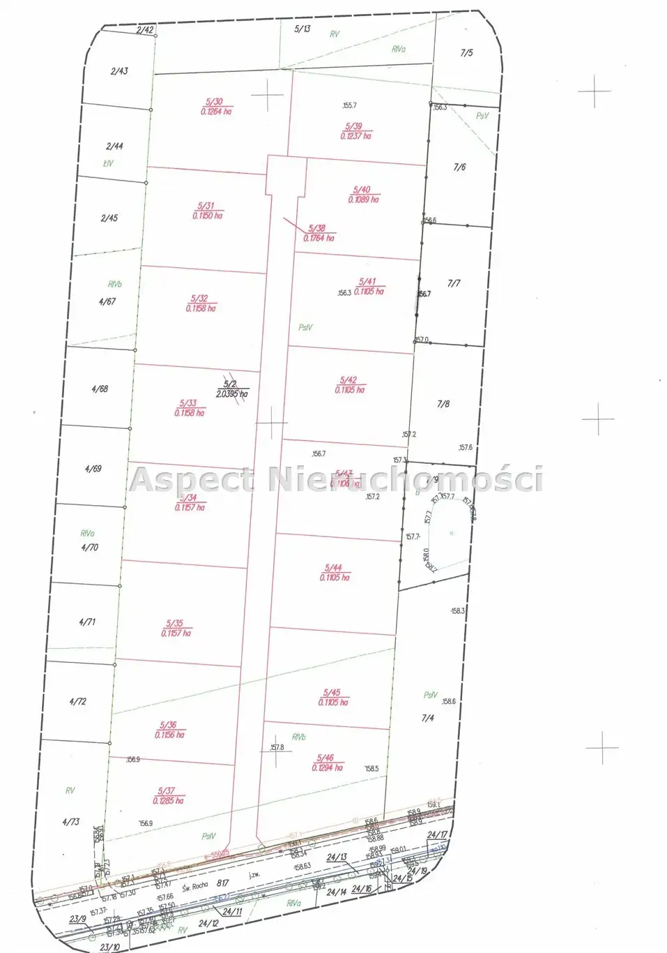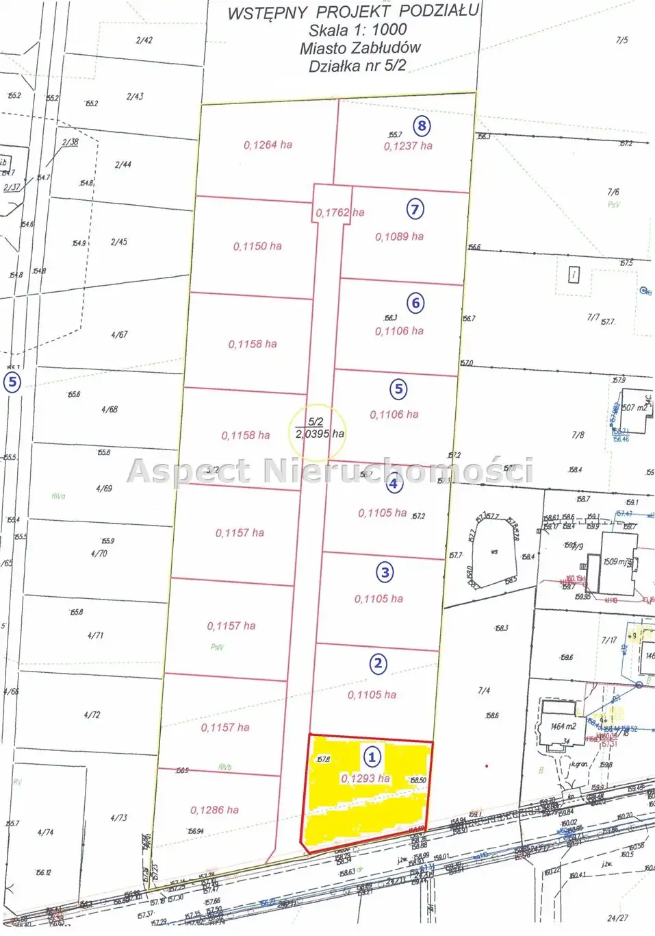 Działka w trakcie podziału geodezyjnego, do wyboru 8 działek zaznaczonych na mapie, położona blisko wybudowanych domów.