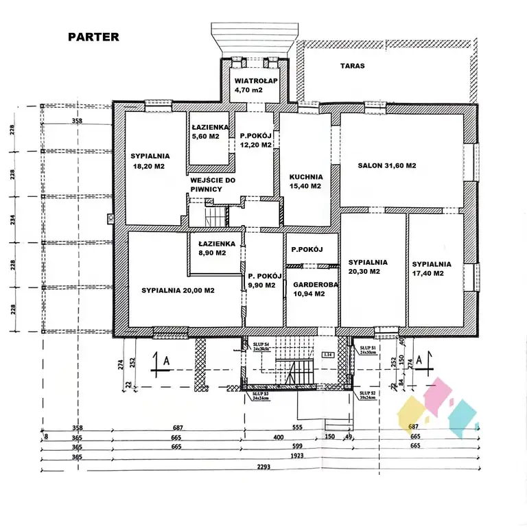 Parter (185 m²): przestronny salon z częścią jadalnianą oraz kuchenną z wyjściem na taras, 2 łazienki z wc i kabiną prysznicową, 4 sypialnie (18, 29, 17, 20 m²), garderoba (14 m²), komunikacja, wiatrołap.