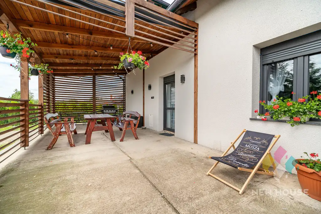 Atutem domu jest zadaszony taras z wygodnym zejściem na posesję, idealny na wspólne rodzinne spotkania.