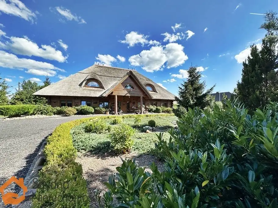 Dom pokryty strzechą 40 cm, ściany z bali kształt prosty docieplony ekofibrem.