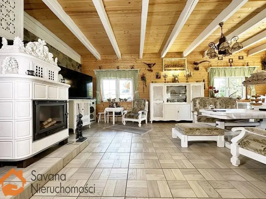 • salon z kominkiem i ogromnymi przeszkleniami oraz pięknym widokiem na ogród,