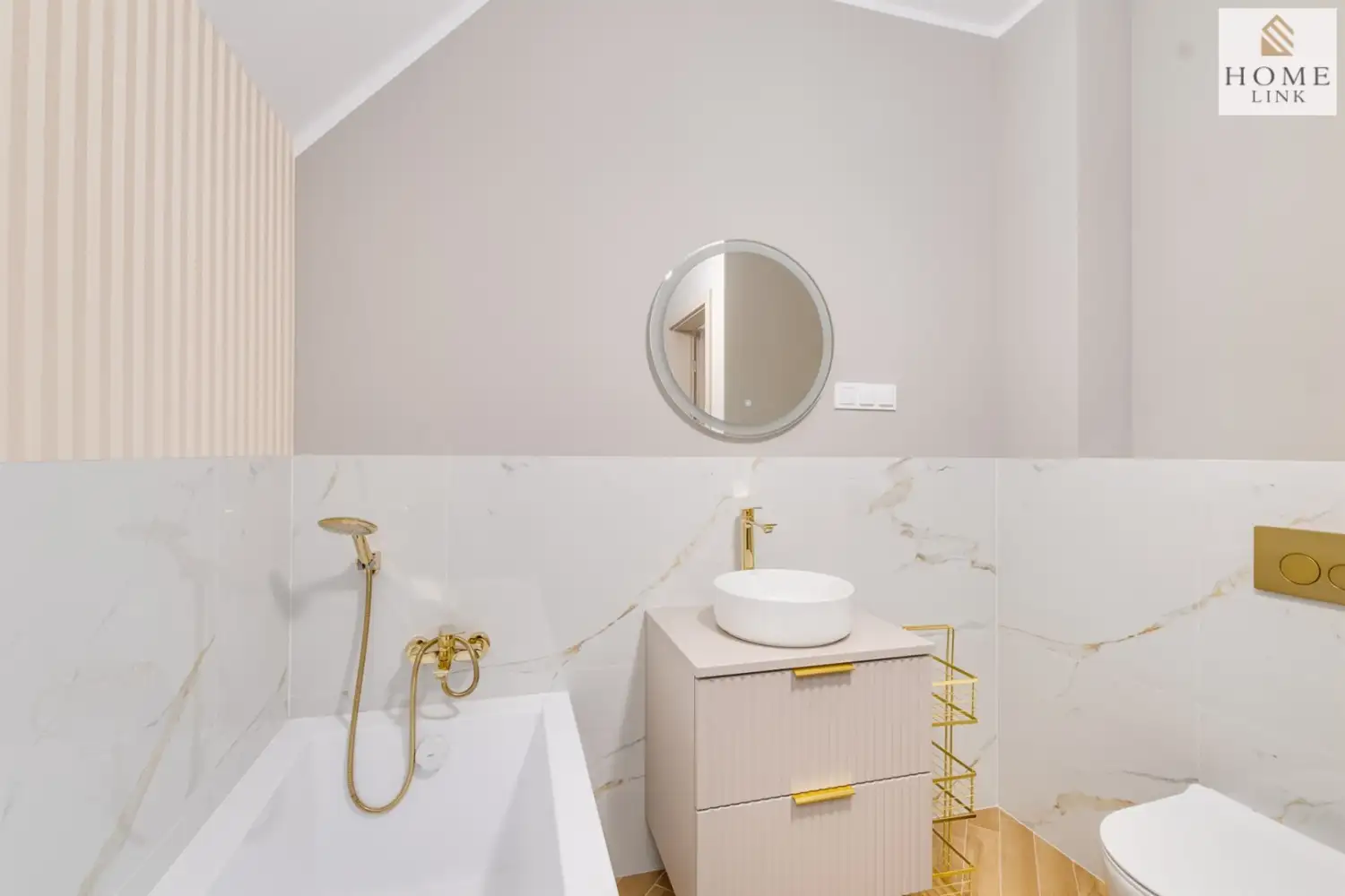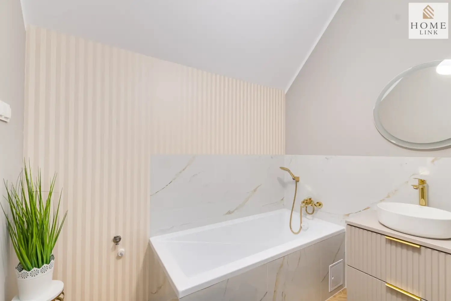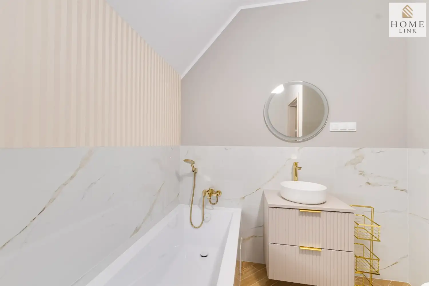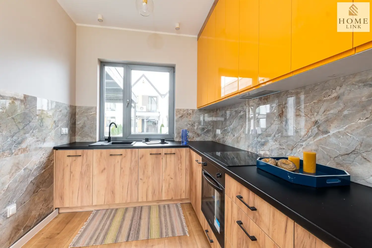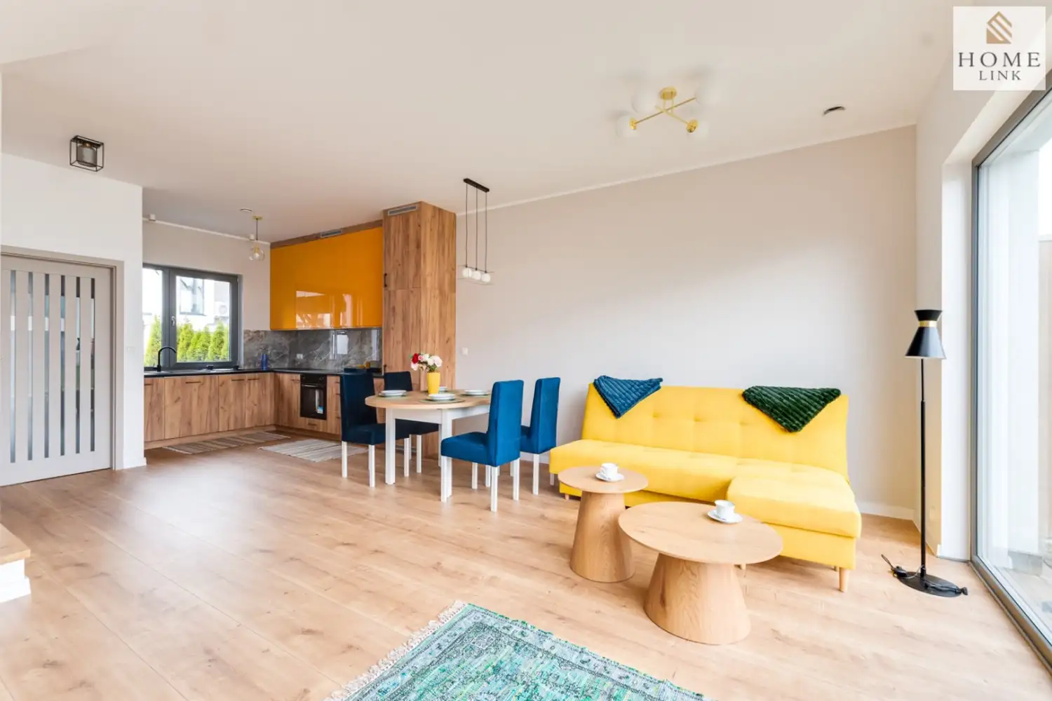 Dom został wybudowany w 2024 roku z betonu komórkowego, ściany zewnętrzne ocieplone dodatkowo styropianem. Dach pokryty jest blachodachówką w kolorze szarym oraz został docieplony wełną mineralną. Elewacja w kolorze białym wraz z szarymi dodatkami. Wnętrze domu to bardzo wysoki standard wykończenia, pomieszczenia wysokie są na odpowiednio: na parterze 2.7m², na piętrze 2.6m², zaimplementowana 3-szybową stolarkę okienną, drzwi antywłamaniowe, ogrzewanie podłogowe w każdym z pomieszczeń, wideo-domofon. Ogrzewanie domu realizowane jest za pomocą ekologicznej pompy ciepła marki Bosch (typu monoblok). Budynek został wyposażony również w system rekuperacji, który został zamontowany na strychu. Dom wykończony został pod klucz, co oznacza, że wszystkie pomieszczenia są przygotowane do użytkowania natychmiast, Wysoki standard wykończenia charakteryzuje się kompletnym wykończeniem kuchni w nowoczesne fronty lakierowane wraz ze sprzętem AGD (lodówka, zmywarka i okap w zabudowie), wykończoną łazienka wraz z niezbędną zabudową czy przygotowanymi pokojami do zamieszkania. W domu znajduje się wideomofon, kompletne oświetlenie i przykładowe meble wolnostojące wraz z dekoracjami (które stanowić mogą oddzielny przedmiot rozmów).