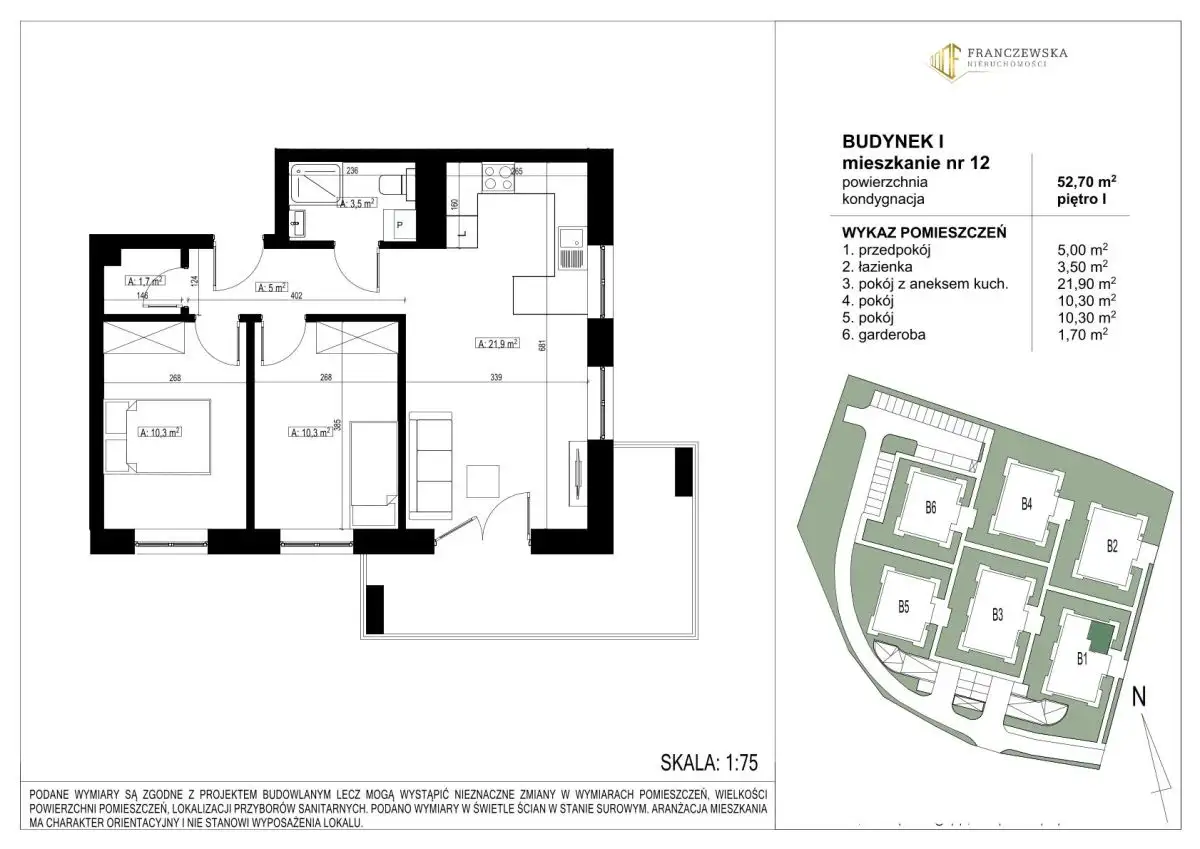 Trzypokojowe mieszkanie o powierzchni projektowej 52,70 m² na 1 piętrze w 3 piętrowym bloku.