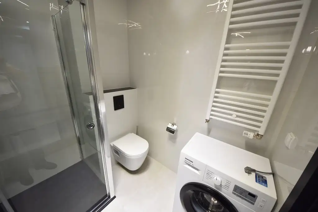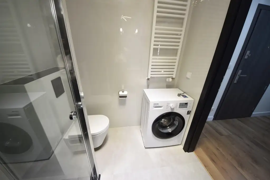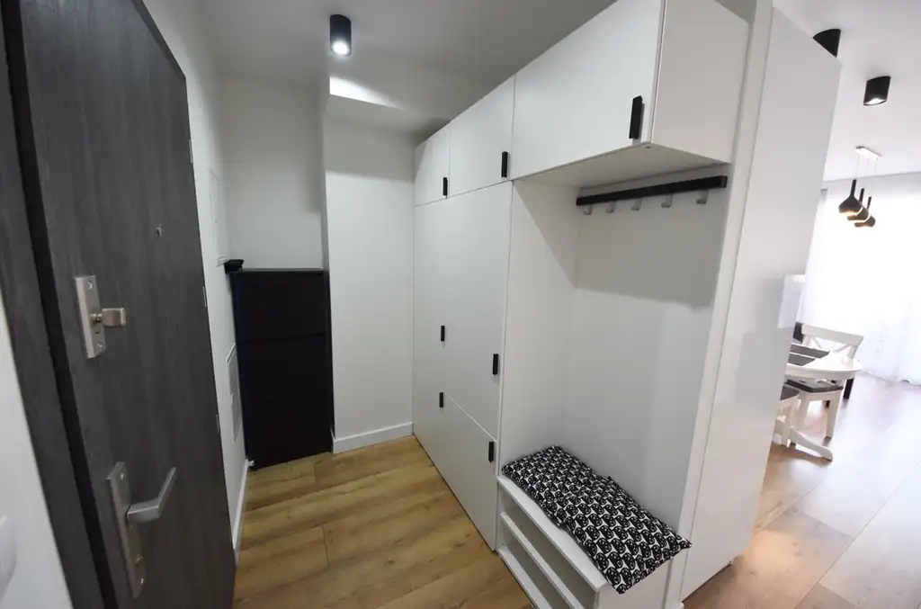 Łazienka, kabina prysznicowa, WC, umywalka, szafka łazienkowa, pralka, akcesoria łazienkowe. Przedpokój, szafa, szafka na buty w zabudowie. Dodatkowe wyposażenie, odkurzacz, kuchnia, garnki, naczynia, sztućce. Balkon stoliki 2 krzesła.