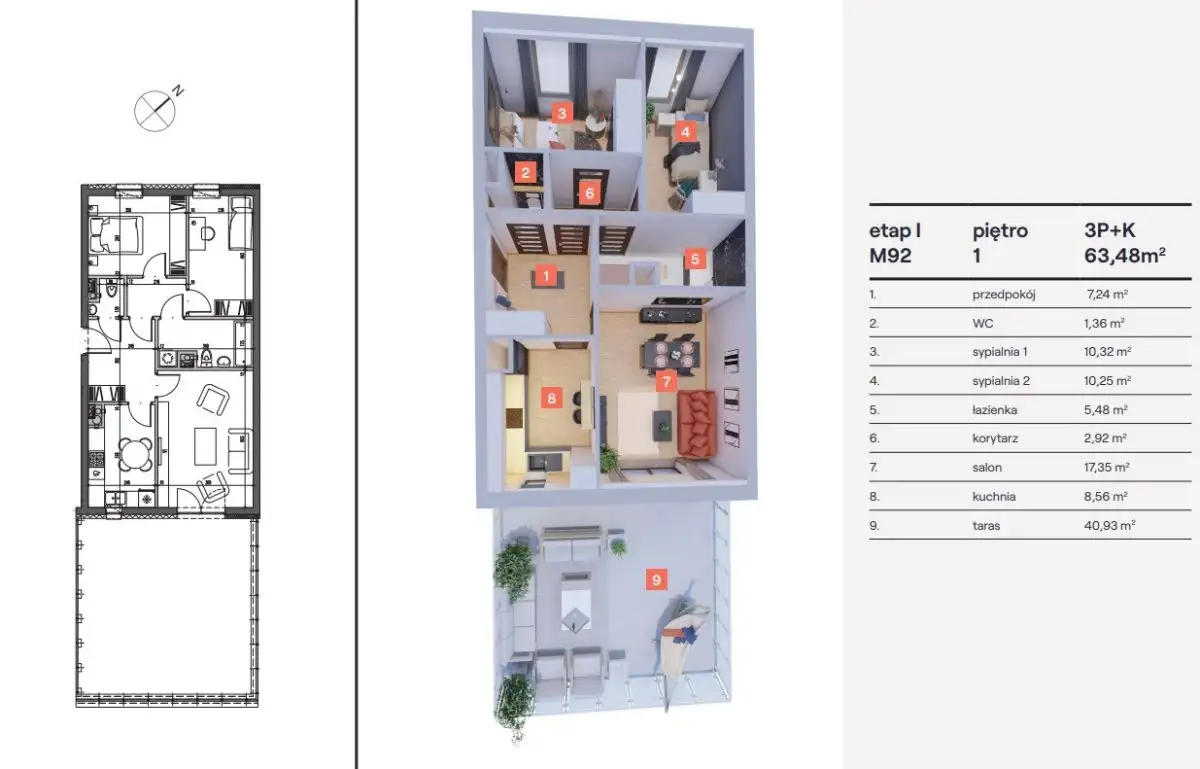 Trzypokojowe mieszkanie o powierzchni projektowej 63,48 m² z wystawą okien na północny-zachód i południowy-wschód
