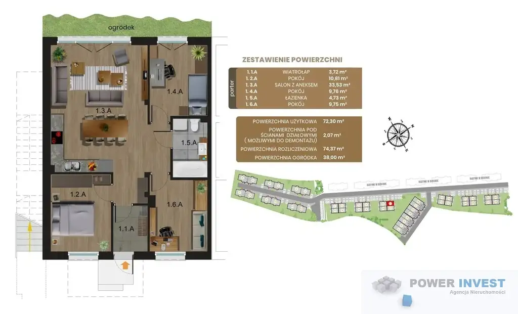 Budynki wybudowane są w układzie czworaków lub w układzie szeregowym Każdy z lokali posiada indywidualne wejście.