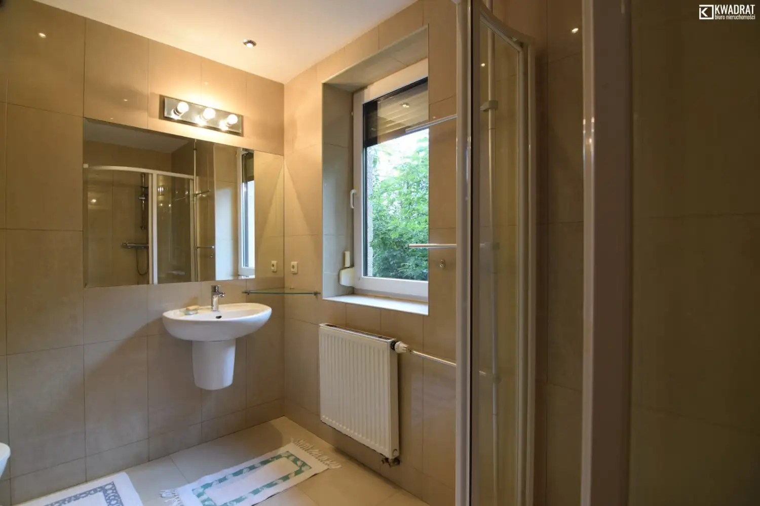 Łazienka sporych rozmiarów, wyposażona w prysznic, umywalkę, wc i lustro. Mieszkanie jest umeblowane (łóżka, szafy, stoły, krzesła).