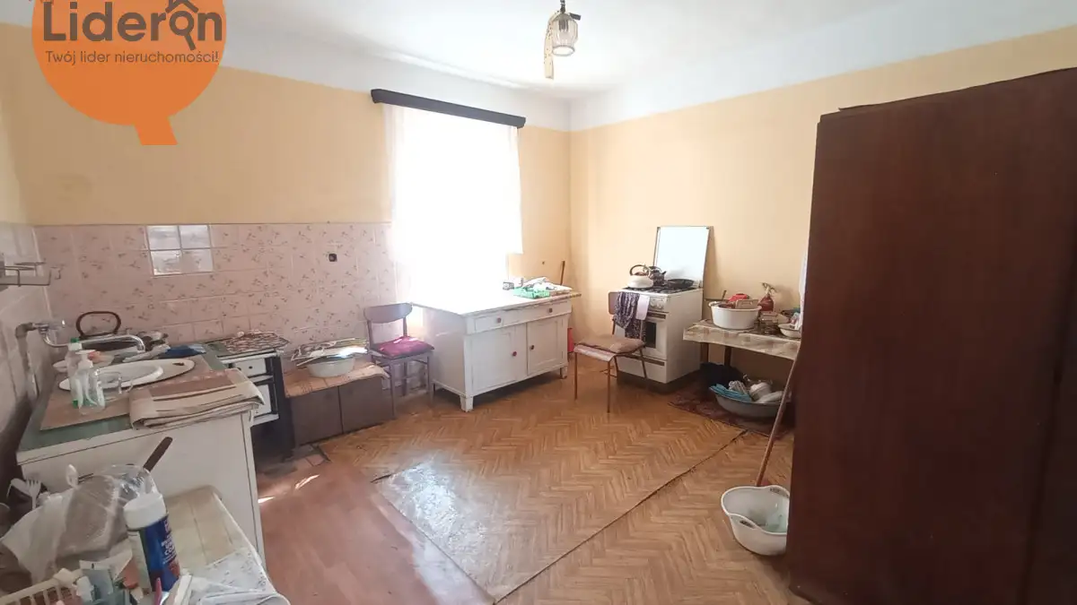 Dom 80m² do kapitalnego/gruntownego remontu lub rozbiórki, składa się z dwóch dużych pokoi i kuchni.