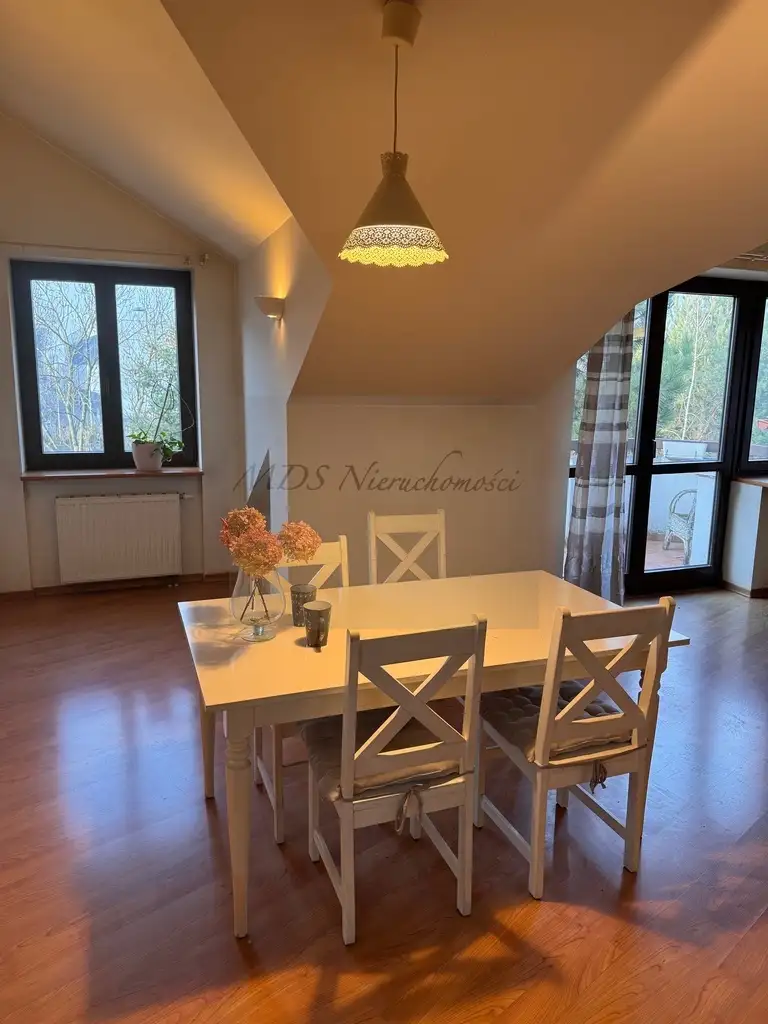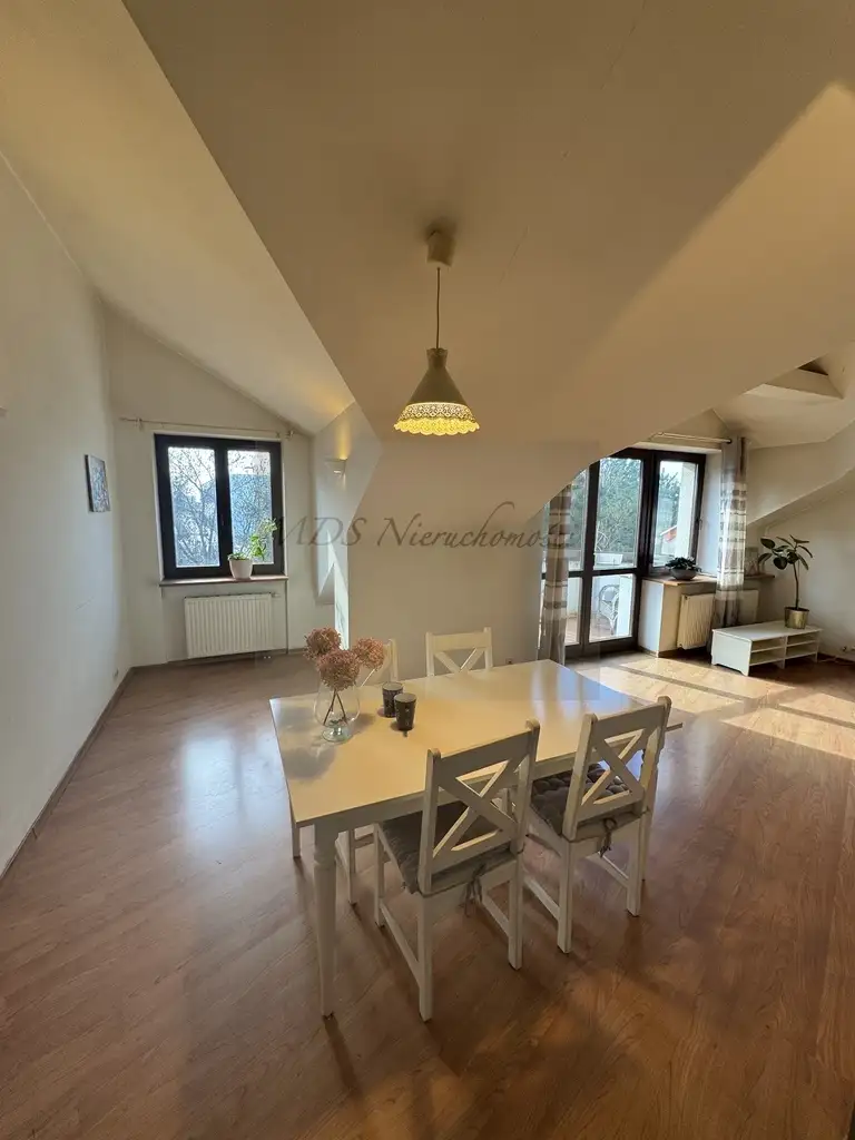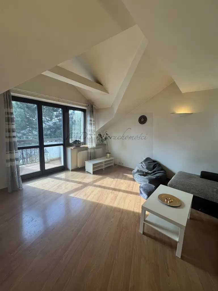 The large living room with sloping ceilings has a balcony facing west, onto Nowoursynowska Street, which is sheltered by beautiful pine trees growing in the garden.