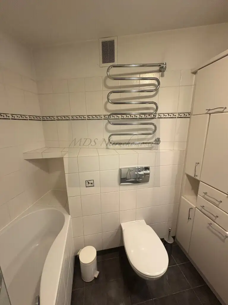 The bathroom is accessed directly from the bedroom. The bathroom is equipped with a bathtub with a shower option, a large alcove for the washing machine and dryer, and a built-in sink with many drawers for storage.