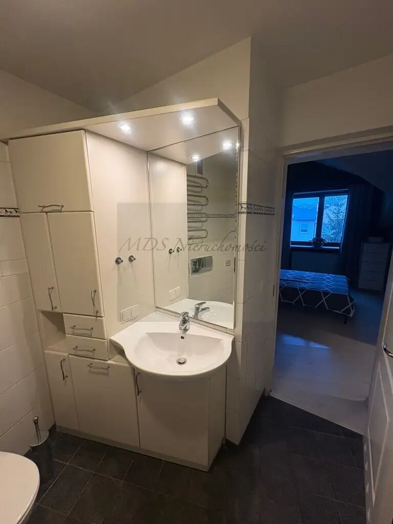 Wprost z sypialni wchodzi sie do łazienki. Łazienka wyposażona jest w wannę z opcją prysznica, ma dużą wnekę na pralkę i suszarkę oraz umywalkę w zabudowie z wieloma szufladami do przechowywania.