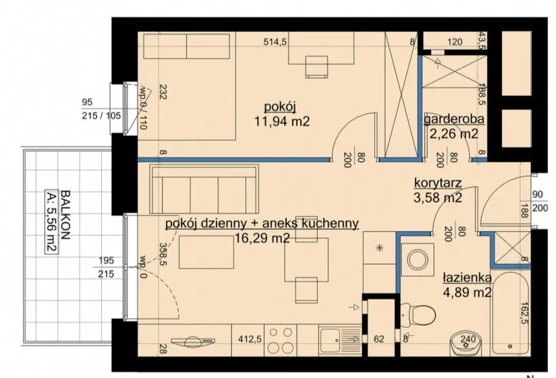 - salon + aneks kuchenny - 16,29 m²
