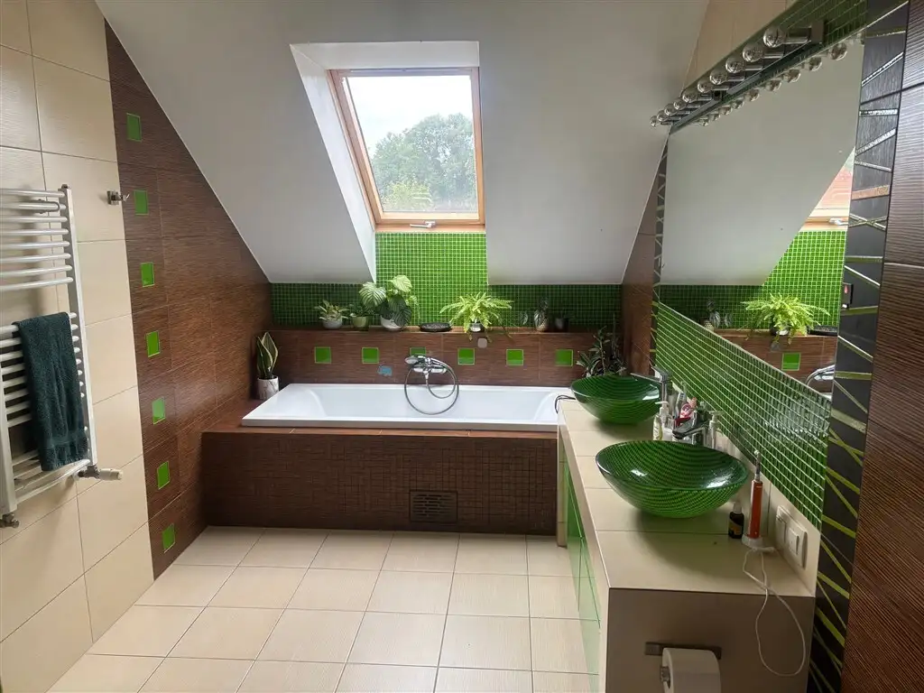 Na parterze zaprojektowano centralnie hall wejściowy bezpośrednio połączony z pokojem dziennym, jadalnią oraz kuchnią. W hallu obok wejścia głównego usytuowano otwarte schody na hall. Obok schodów znajduje się pomieszczenie gospodarcze – kotłownia. Na wprost schodów znajduje się łazienka oraz dodatkowy pokój. Na piętrze budynku znajdują się natomiast 3 pokoje oraz łazienka. Dodatkowo nad garażem znajduje się pomieszczenie strychowe (aktualnie zaadaptowane na cele mieszkalne). Garaż umiejscowiony od frontu budynku. W budynku centralne ogrzewanie na gaz oraz kominek w salonie.