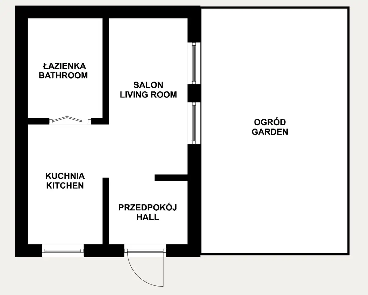 Pokoje: Sypialnia, otwarta kuchnia, przedpokój, łazienka, ogród