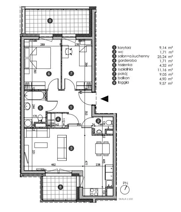 Opis mieszkania:-Pokój dzienny o pow. 25,24 m² z wyjściem na loggie o pow. 4,90 m²