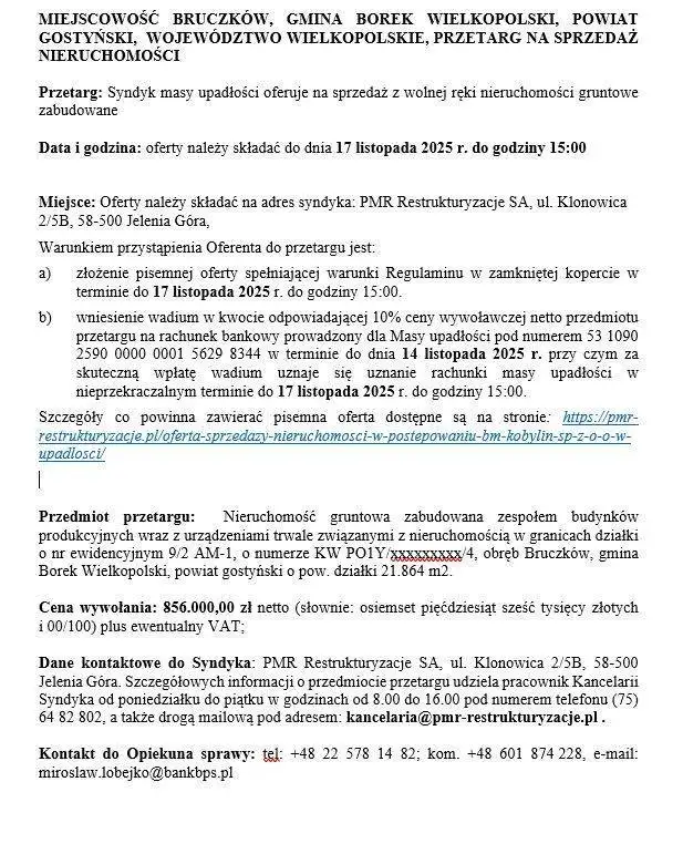 Przedmiot przetargu: Nieruchomość gruntowa zabudowana zespołem budynków produkcyjnych wraz z urządzeniami trwale związanymi z nieruchomością w granicach działki o nr ewidencyjnym 9/2 AM-1, o numerze KW PO1Y/xxxxxxxxx/4, obręb Bruczków, gmina Borek Wielkopolski, powiat gostyński o pow. działki 21.864 m².