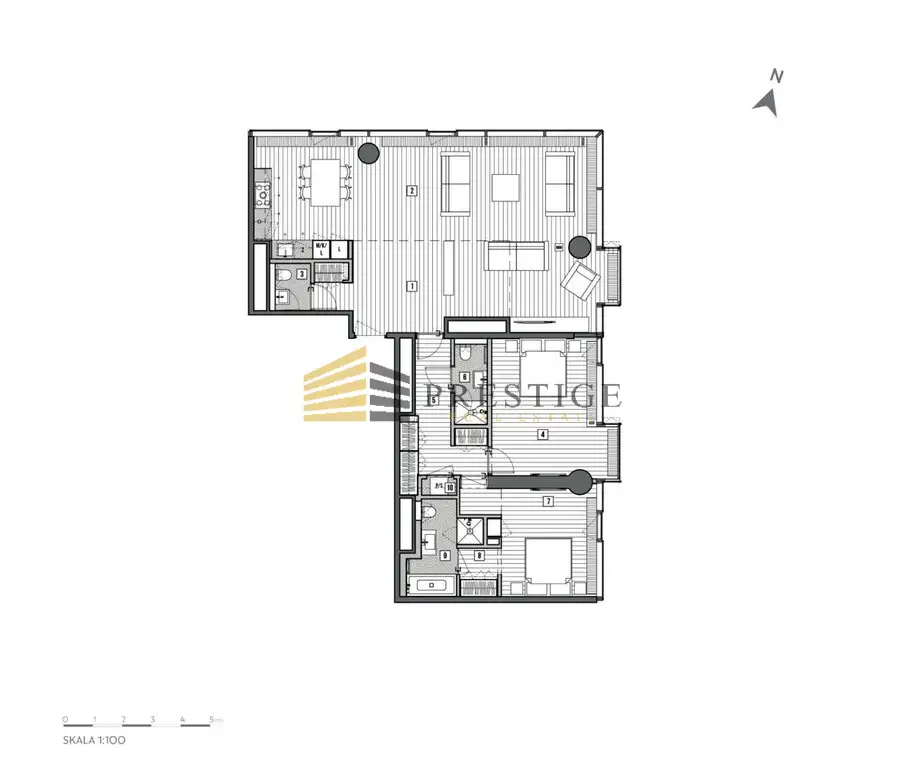 Apartament o powierzchni 135m² położony jest na 35. piętrze (orientacja: północ/wschód) i jest praktycznie podzielony na część dzienną (gościnną) i nocną (sypialną).