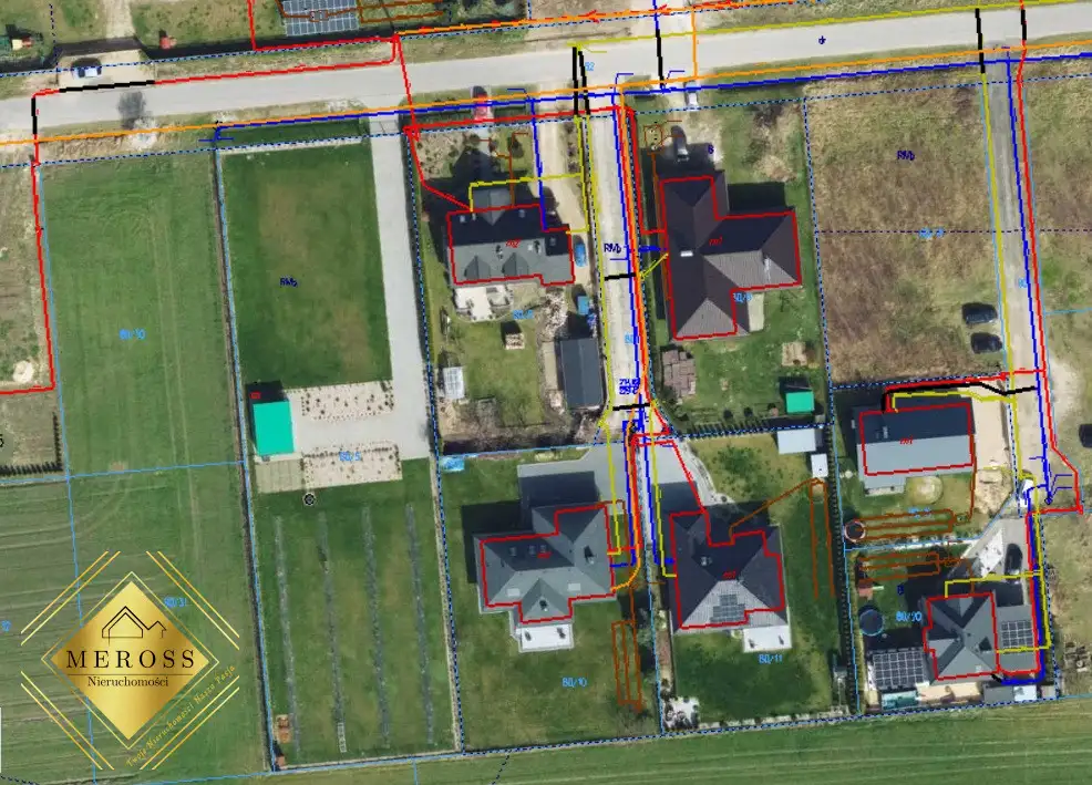 Działka jest ogrodzona, utwardzona, a droga wewnętrzna pokryta kostką brukową.