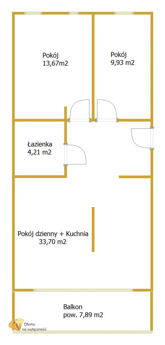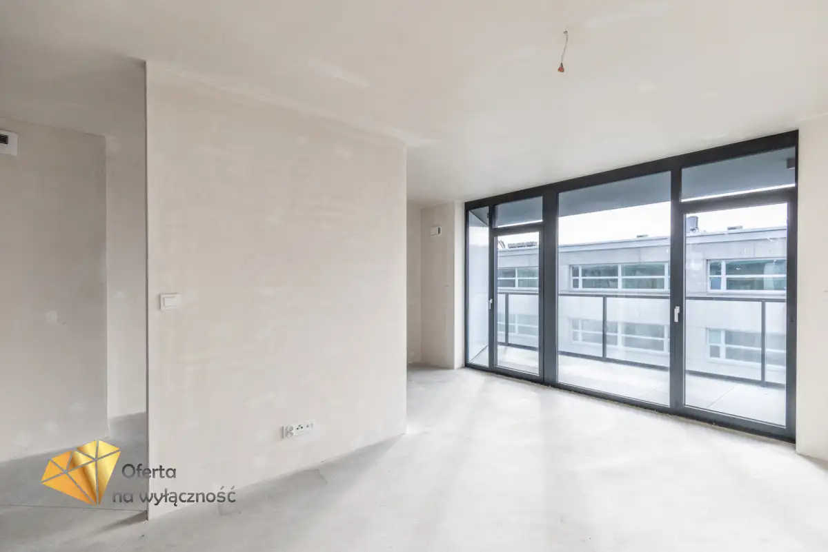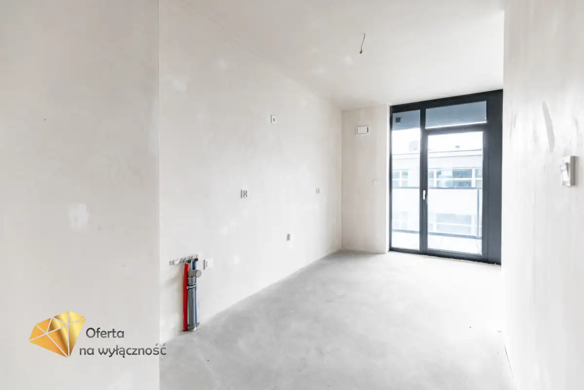 Pokój dzienny z kuchnią o pow. 33,70 m² z wyjściem na balkonem o pow. 7,89 m²