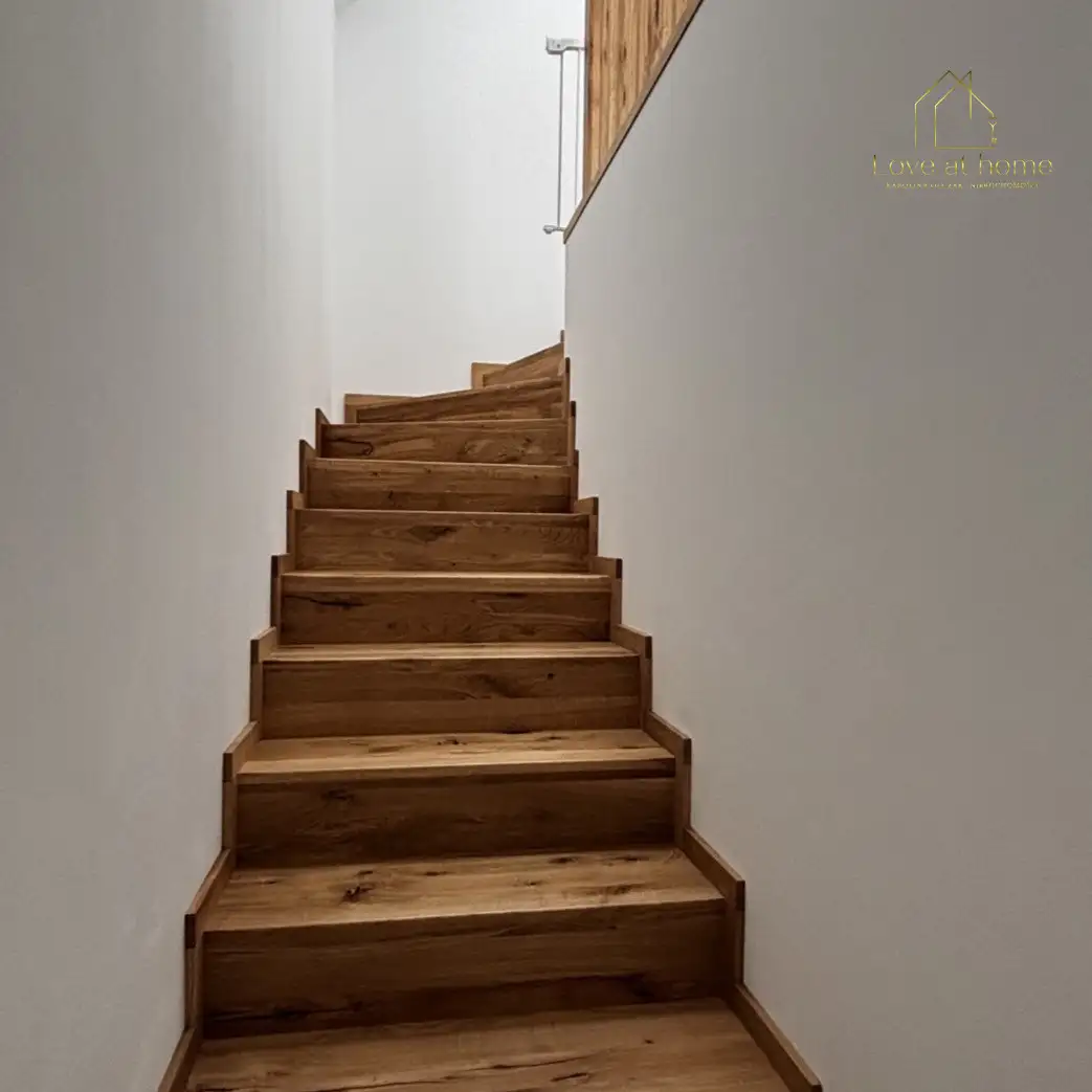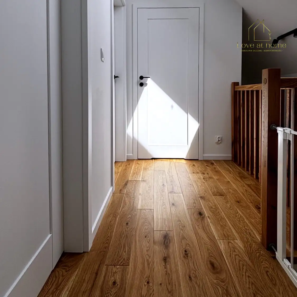 Na piętro prowadzą przepiękne dębowe schody solidnie wykonane , tworząc ciepłą estetykę całego domu.