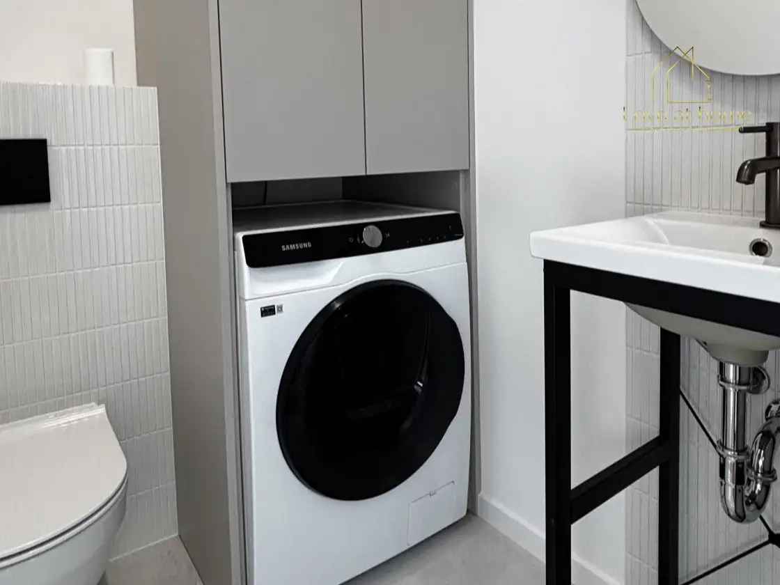 Łazienka kompaktowa z umywalką i miejsce na pralko suszarkę w minimalistycznym stylu. Nadaje całości pięknego charakteru.
