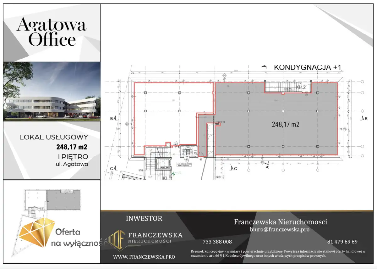 Na sprzedaż unikalny lokal handlowo-usługowy o powierzchni 248,17 m², położony na I piętrze nowoczesnego budynku Agatowa Office przy ul. Agatowej w Lublinie. Przestrzeń z ekspozycją okien na trzy strony świata oferuje wyjątkowy widok na tereny zielone, zapewniając komfortową atmosferę pracy. Budynek o minimalistycznym, eleganckim designie łączy funkcjonalność z estetyką, idealnie wpisując się w potrzeby przedsiębiorców i inwestorów. Lokal posiada dwa wejścia: z holu oraz niezależne wejście zewnętrzne - idealne dla branży medycznej. Dodatkowym atutem jest wykończenie przygotowane do dalszej aranżacji.