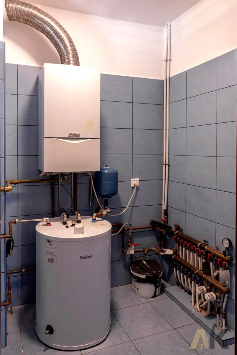 • Ogrzewanie - piec gazowy (dwu-funkcyjny) oraz kominek z rozprowadzeniem ciepła na pokoje,