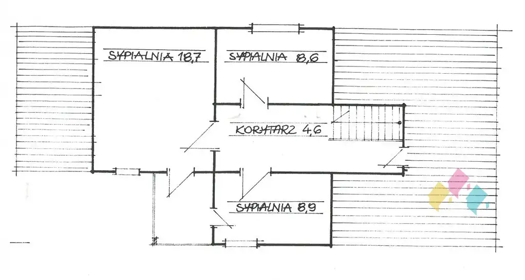 Poddasze mieści trzy sypialnie (ok. 8,9 m², ok. 8,6 m², ok. 18,7 m²), z czego dwie mają wyjście na taras z widokiem na ogród.