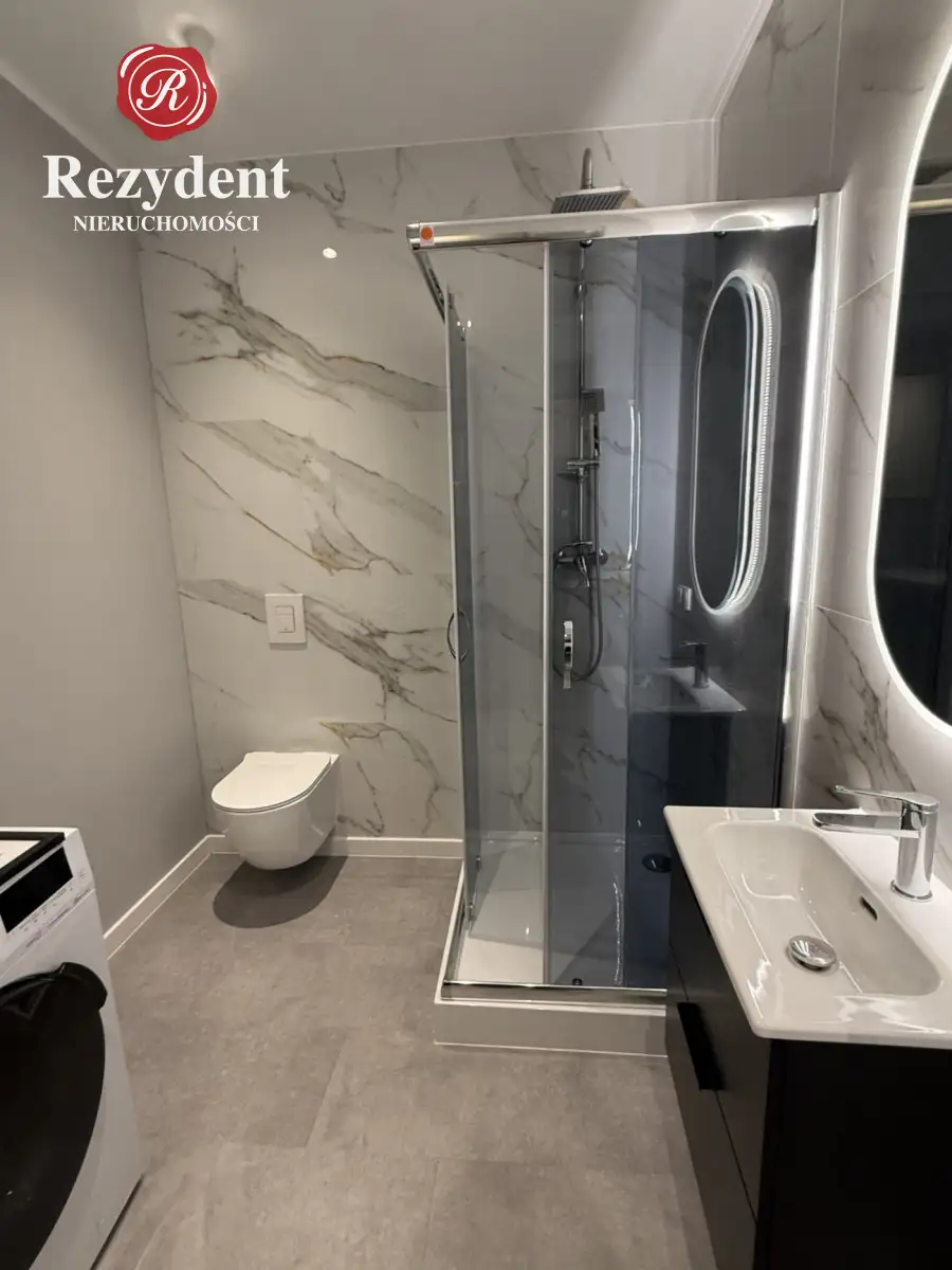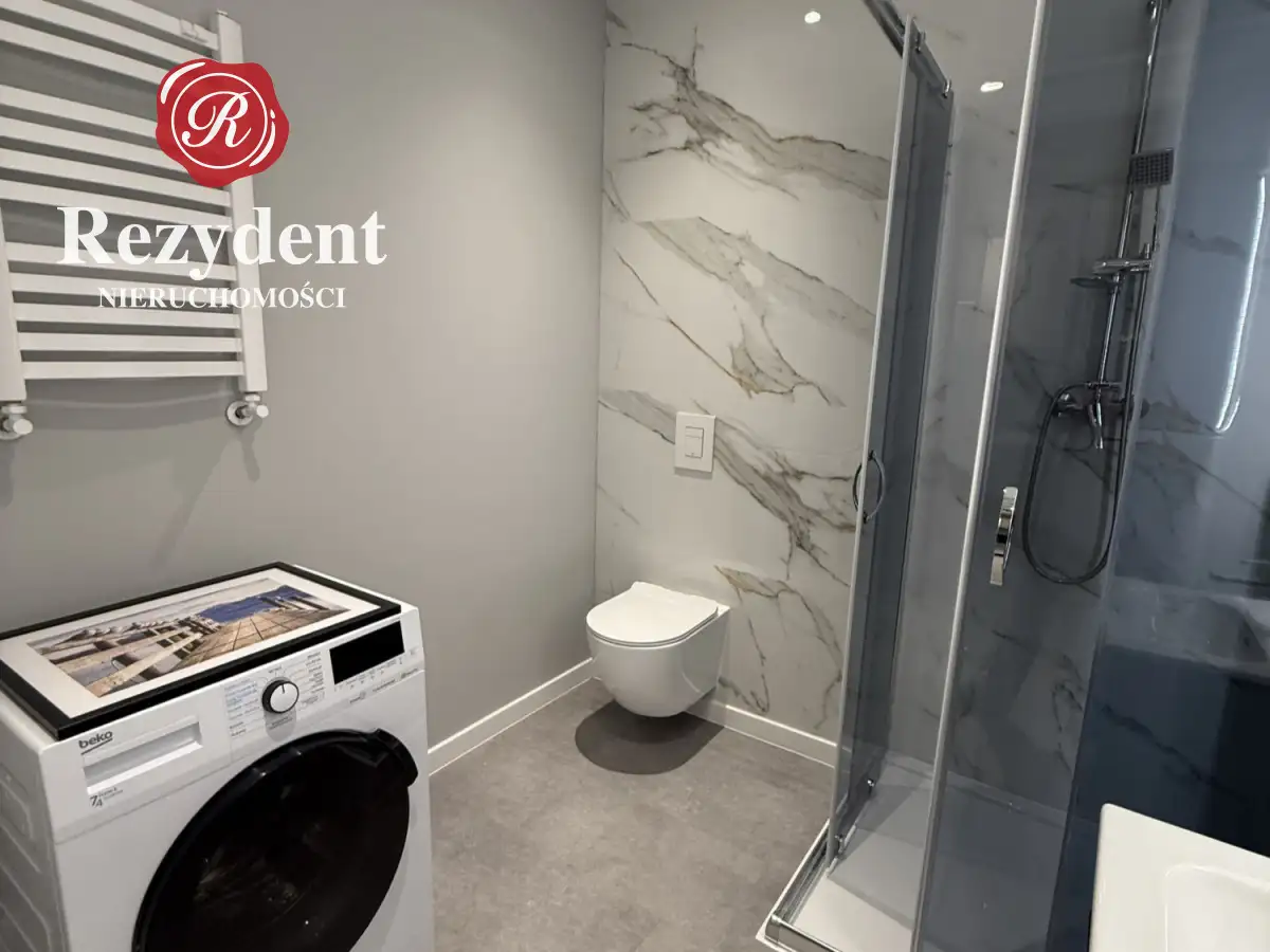Łazienka (4m²) z kabiną prysznicową, toaletą, umywalką oraz pralko-suszarką.