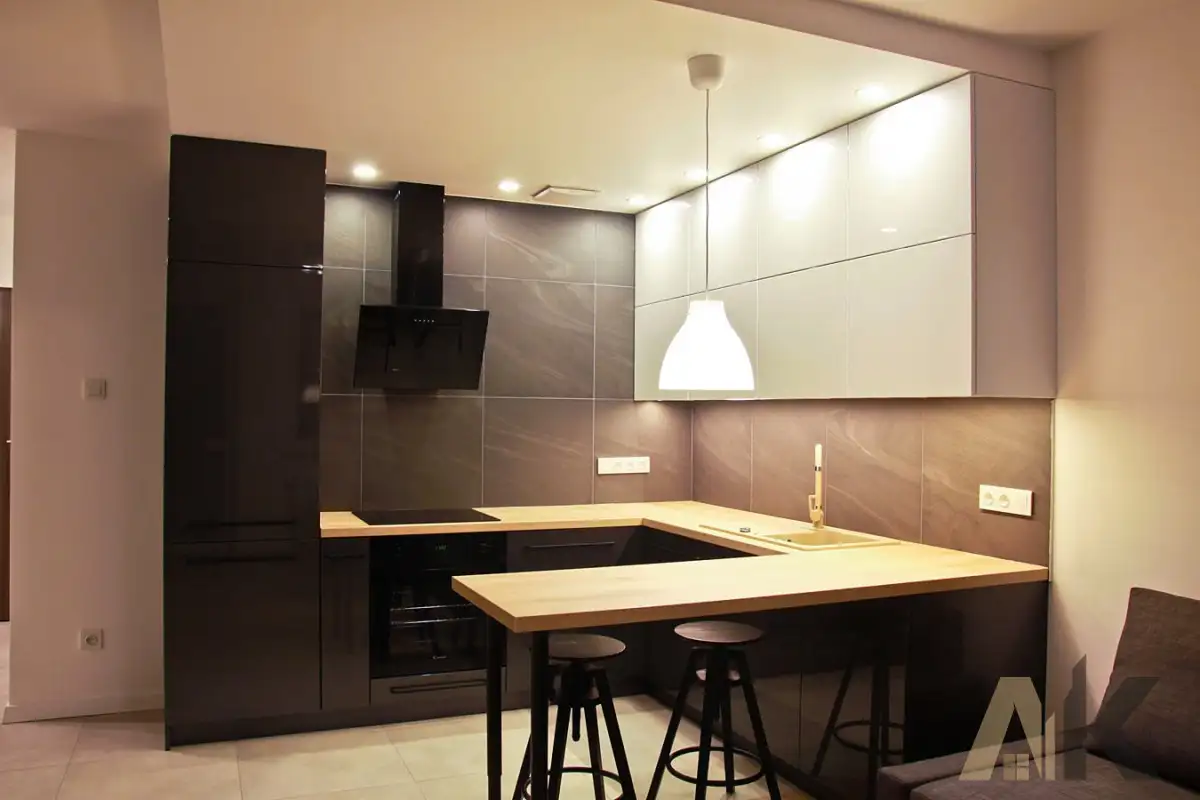 W zabudowie kuchennej: zlewozmywak, zmywarka, lodówka, piekarnik płyta indukcyjna, okap w zabudowie meblowej.
