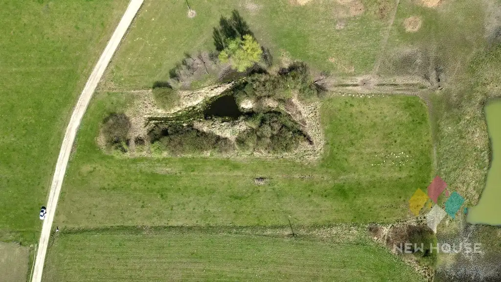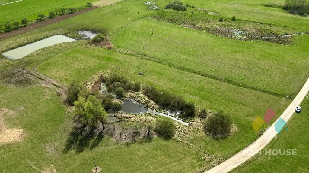 Teren płaski z oczkiem wodnym, które ma ok. 100 m² (możliwość powiększania do 500 m²)