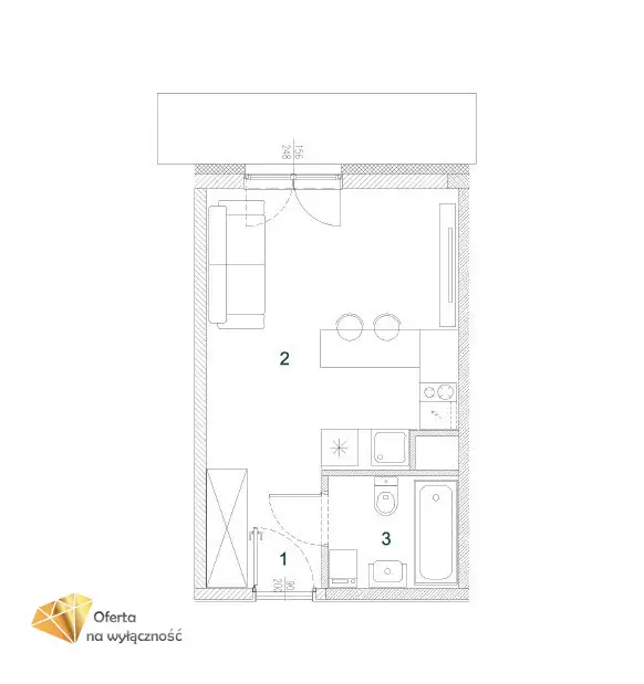 W skład mieszkania wchodzi:Salon z aneksem kuchennym (pow. 17,98m²)