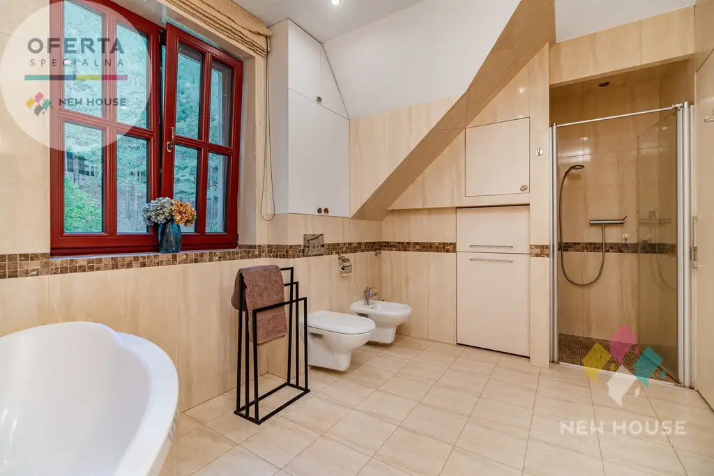 - łazienka ok. 10 m² z prysznicem, wanną i bidetem
