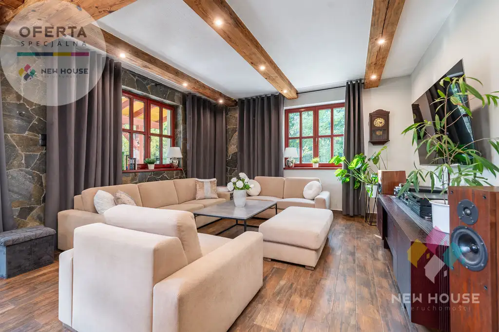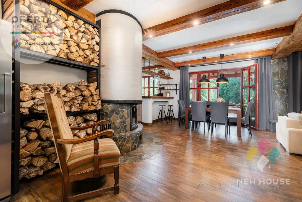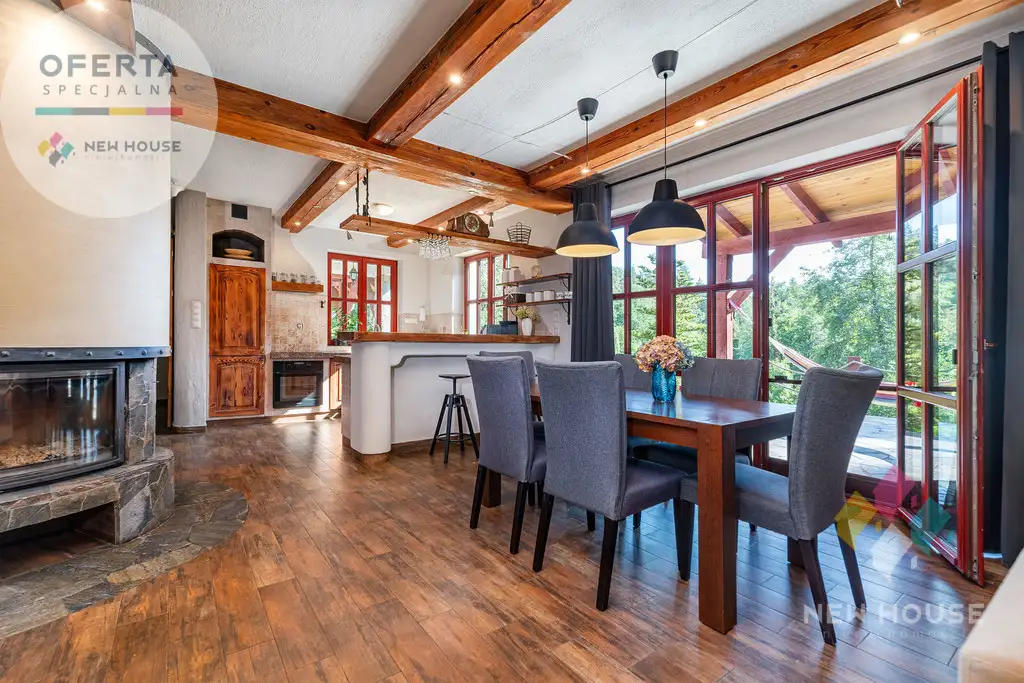 Centralnym punktem domu jest klimatyczny salon z kominkiem i nadającymi charakteru drewnianymi belkami stropowymi.