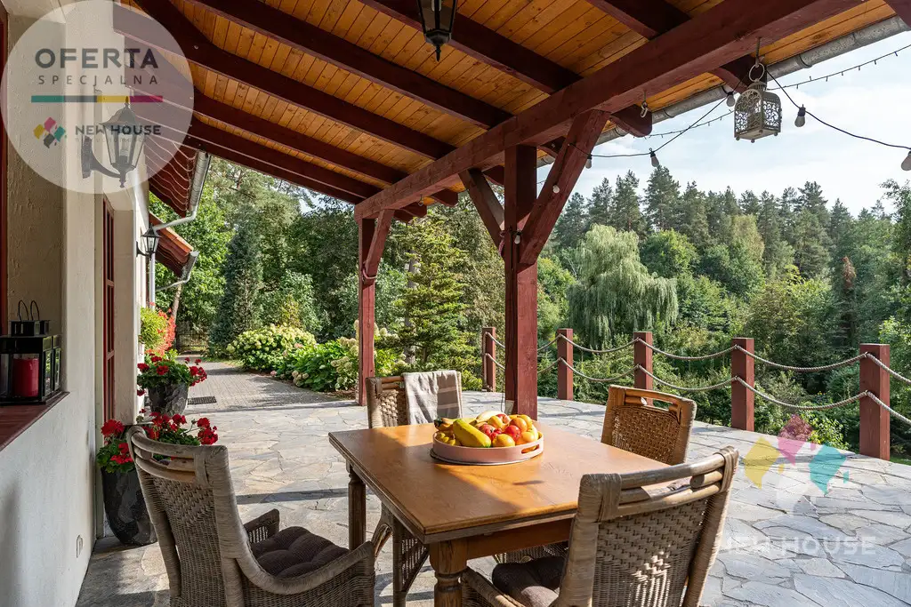 Taras od strony południowej z urzekającym widokiem na rzekę, częściowo zadaszony, wyłożony płytami z ciętego kamienia.