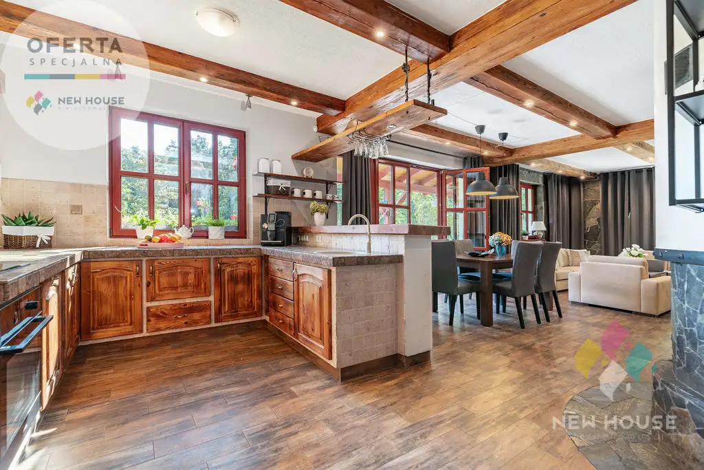 - kuchnia ok. 10 m² z drewnianymi meblami w zabudowie