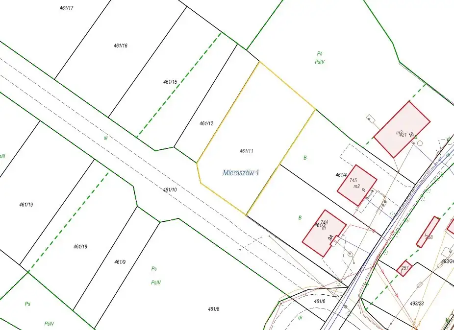 Nieruchomość gruntowa o powierzchni 0,1170 ha, położona w obrębie Mieroszów 1. Działka nr 461/16 jest niezabudowana i aktualnie stanowi nieużytkowane pastwisko. Działka gruntowa o kształcie prostokąta z zachowaną proporcją długości boków, teren o lekkim spadku w kierunku ulicy Wysokiej. Nieruchomość położona w sąsiedztwie terenów uzbrojonych (bez sieci gazowej), aktualnie działka nie jest uzbrojona.