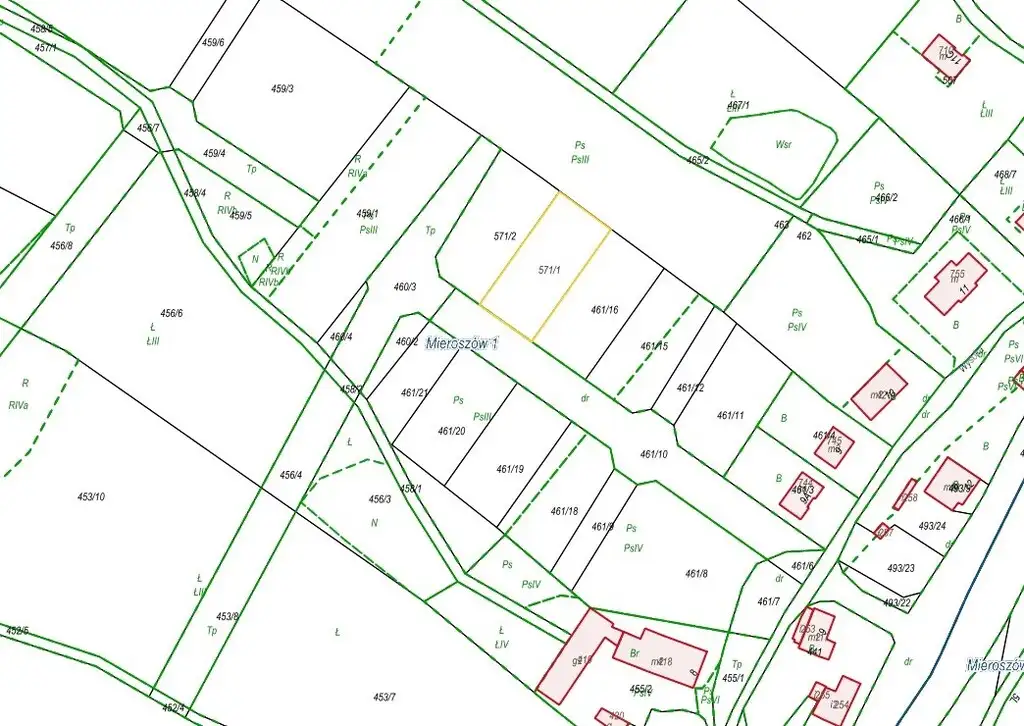 Nieruchomość gruntowa o powierzchni 0,1146 ha, położona w obrębie Mieroszów 1. Działka nr 571/1 jest niezabudowana i aktualnie stanowi pastwisko. Działka gruntowa o kształcie prostokąta z zachowaną proporcją długości boków, teren o bardzo lekkim spadku w kierunku północno – wschodnim i ulicy Wysokiej. Nieruchomość położona w odległości około 140 m od terenów uzbrojonych (bez sieci gazowej). Aktualnie działka nie jest uzbrojona, w pasie wydzielonej geodezyjnie ulicy (działka 461/10) zaprojektowana jest sieć wodno - kanalizacyjna.