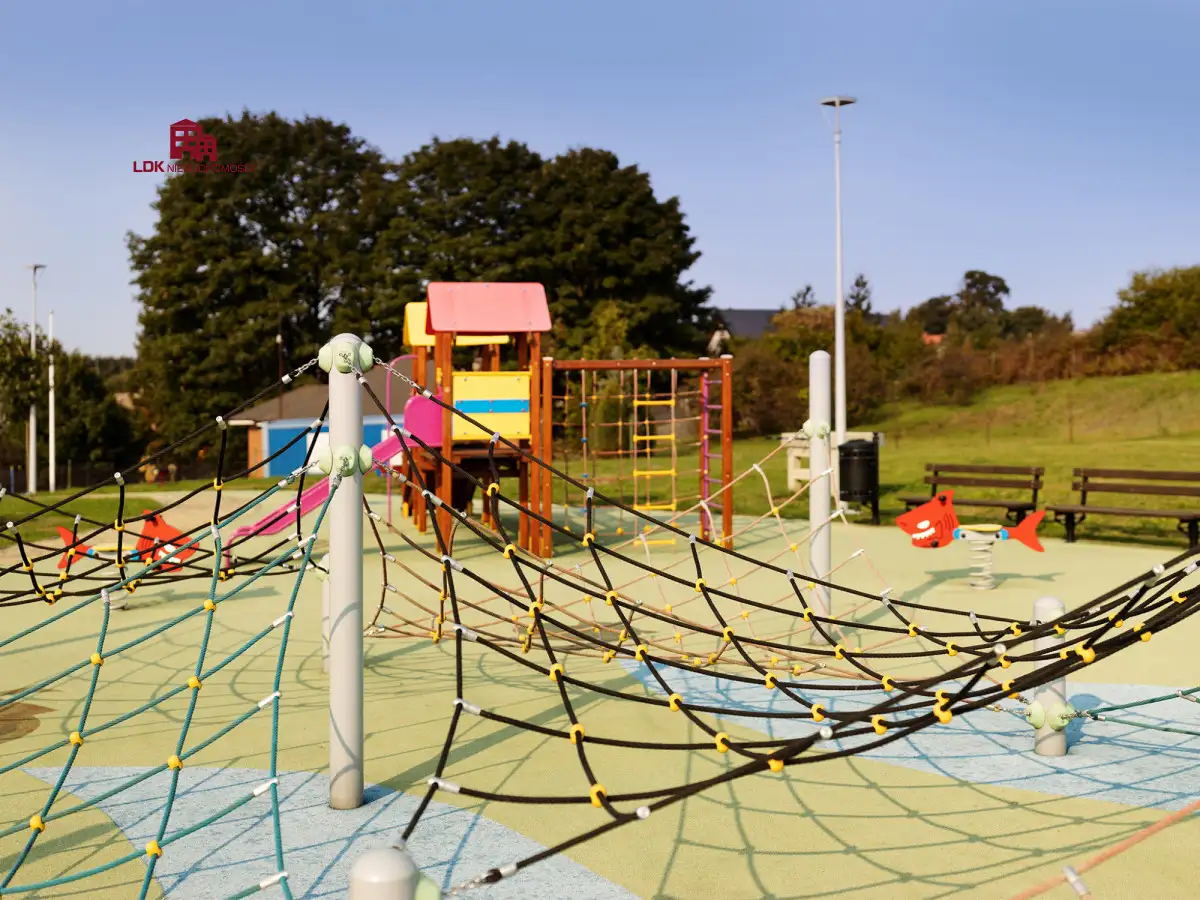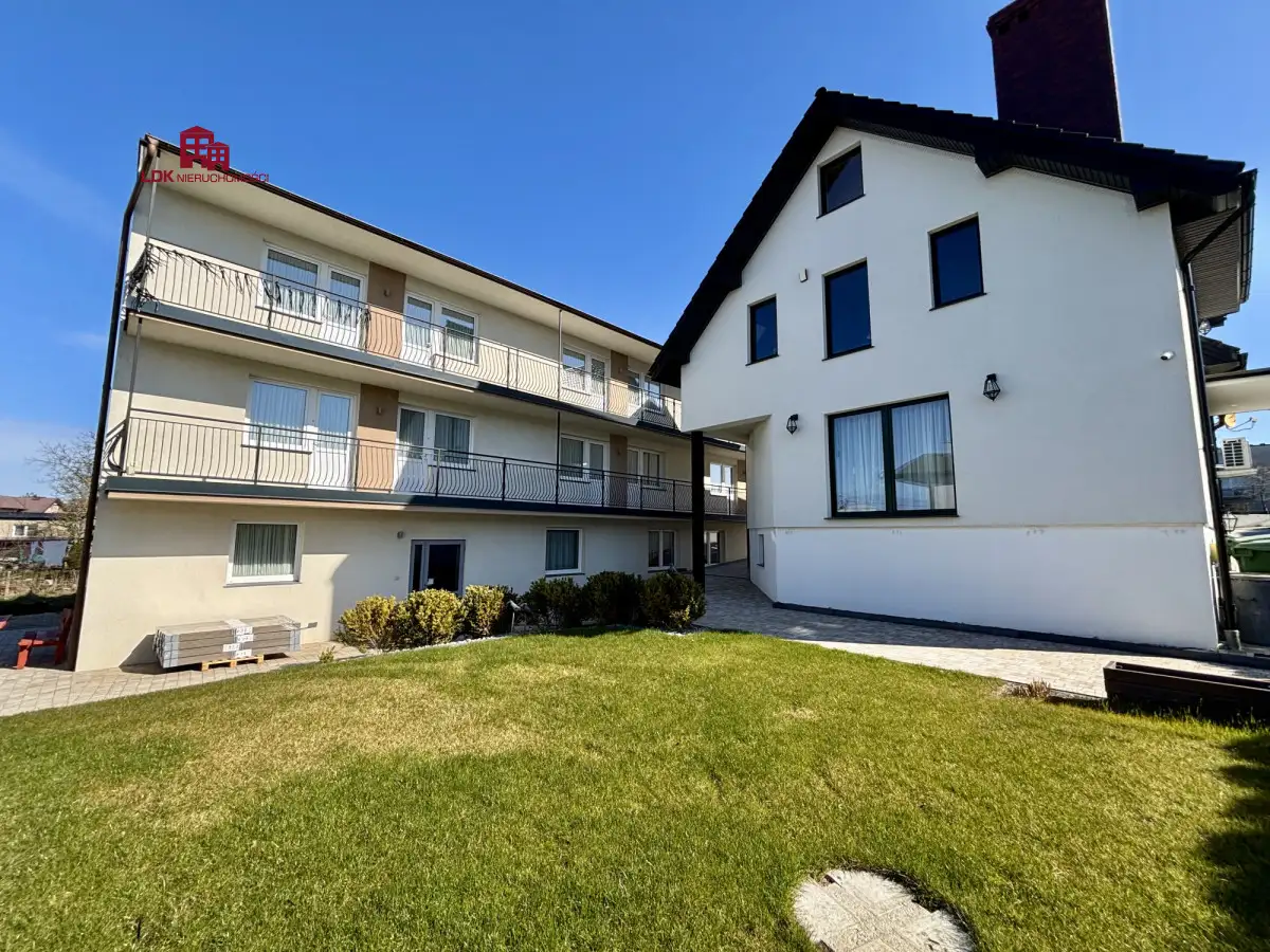 Zadbana, zielona przestrzeń wokół obu budynków - idealna do wypoczynku, rekreacji lub organizacji wydarzeń dla gości.