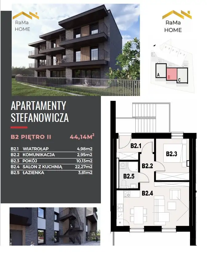 ostatnie mieszkania!W skład mieszkania o powierzchni 44,14m² wchodzi:- salon z aneksem kuchennym (22,27m²)
