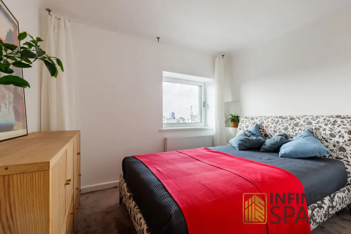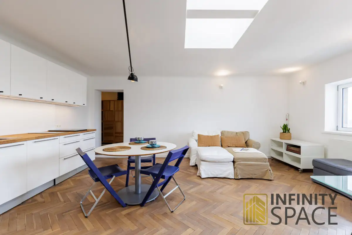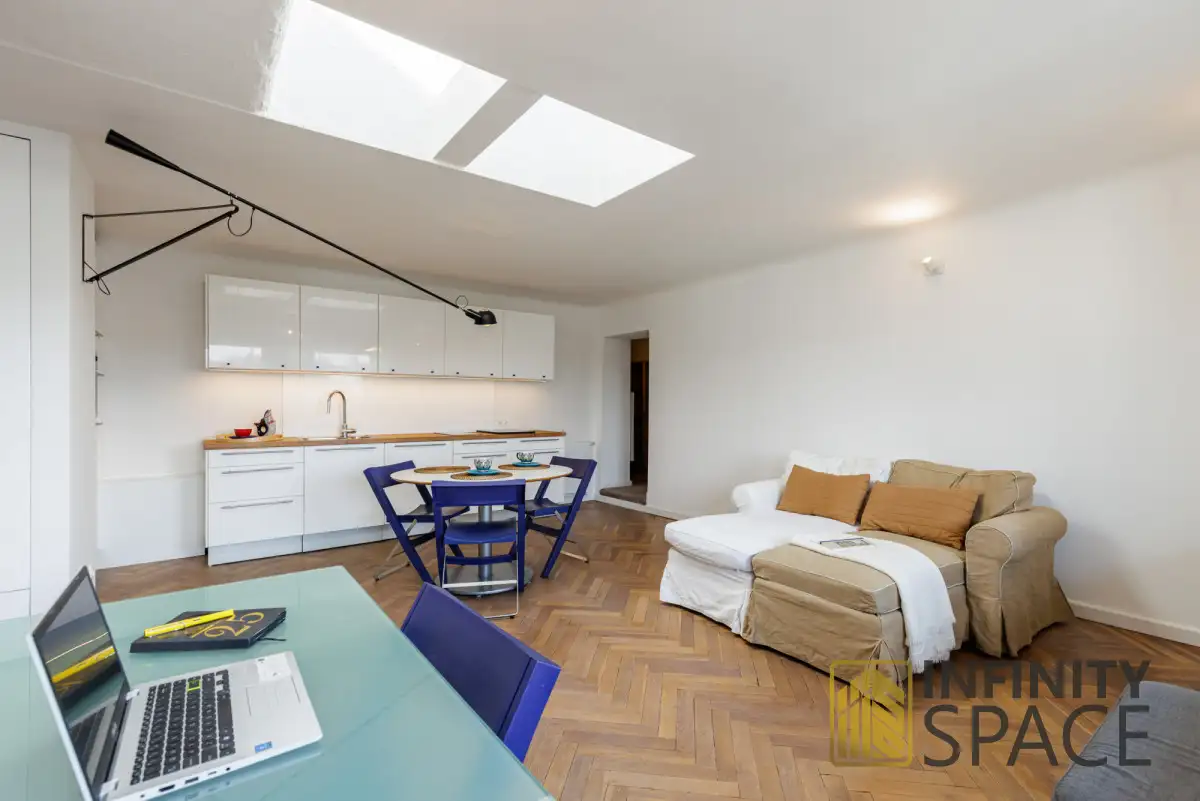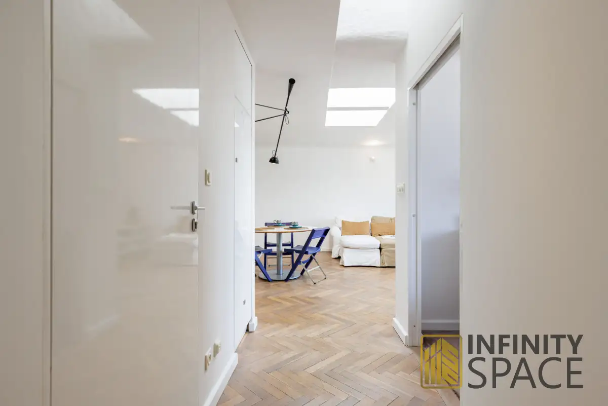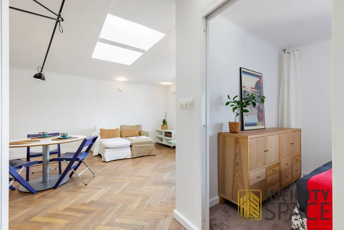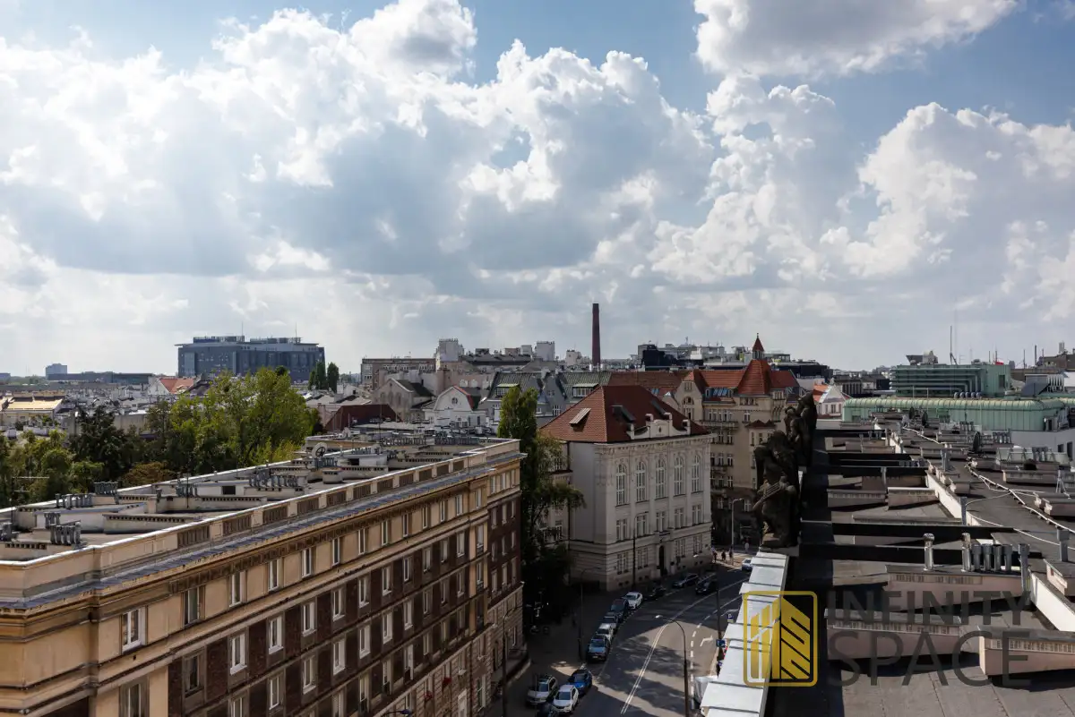 An apartment on Plac Konstytucji with skylights on the roof and a beautiful view of Koszykowa Street from above.