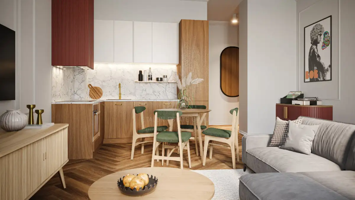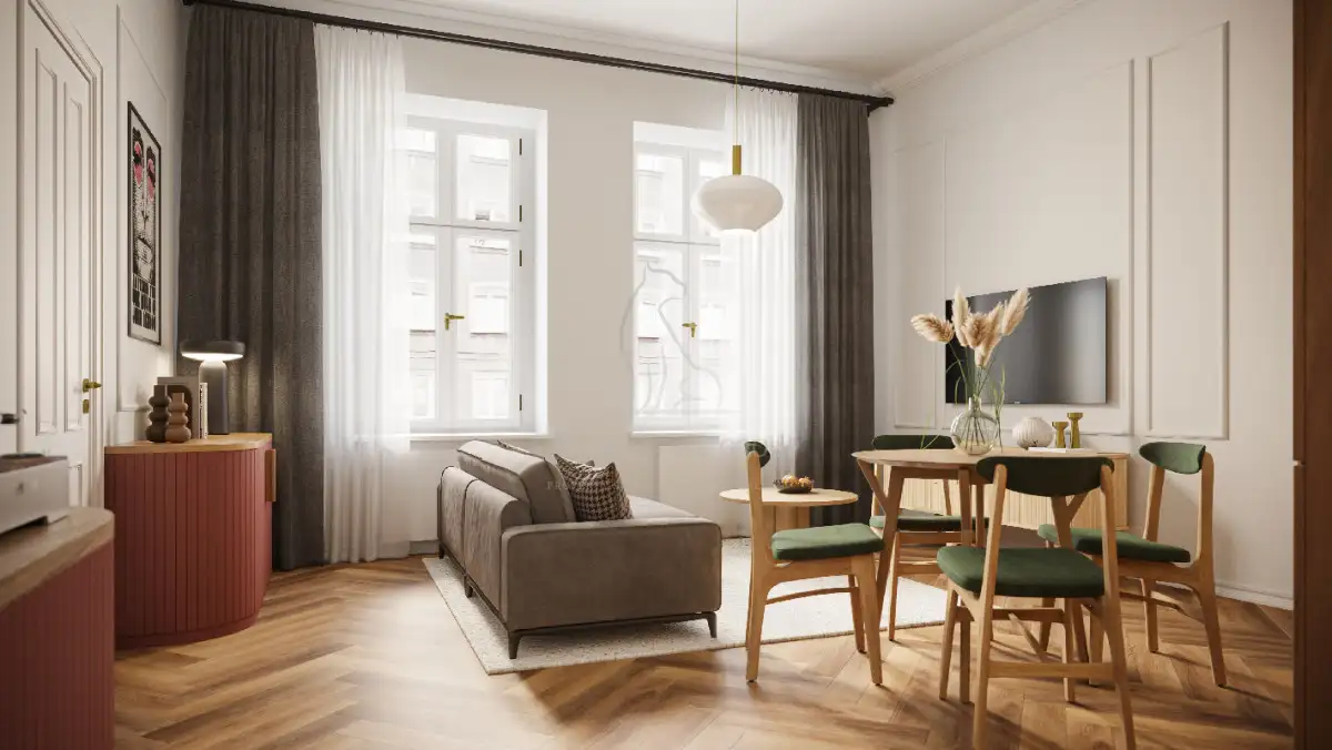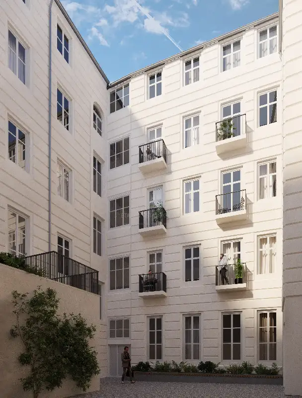 Od progu eleganckie i reprezentacyjne wejście, które pięknie wpasuje się w otoczenie. Elewacja kamienicy odzyska swój elegancki wygląd i zostanie podkreślona ozdobnymi gzymsami i dekoracyjnymi sztukateriami.