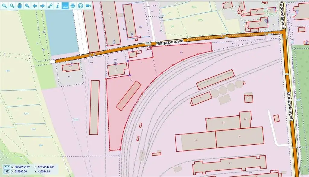 Atrakcyjny teren przemysłowy położony w bliskiej odległości od centrum Opola - 1,3 km, w sąsiedztwie Cementowni ODRA, z dogodnym układem komunikacyjnym, szybkim dojazdem do obwodnicy północnej miasta ul. Powstańców Warszawskich (DK 45,46,94) przez ul. Budowlanych (DW 454) - 2,6 km. Teren utwardzony, nadający się na plac składowy, magazynowy, produkcję przemysłową, bazę transportową, logistykę, itp.