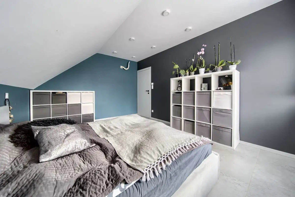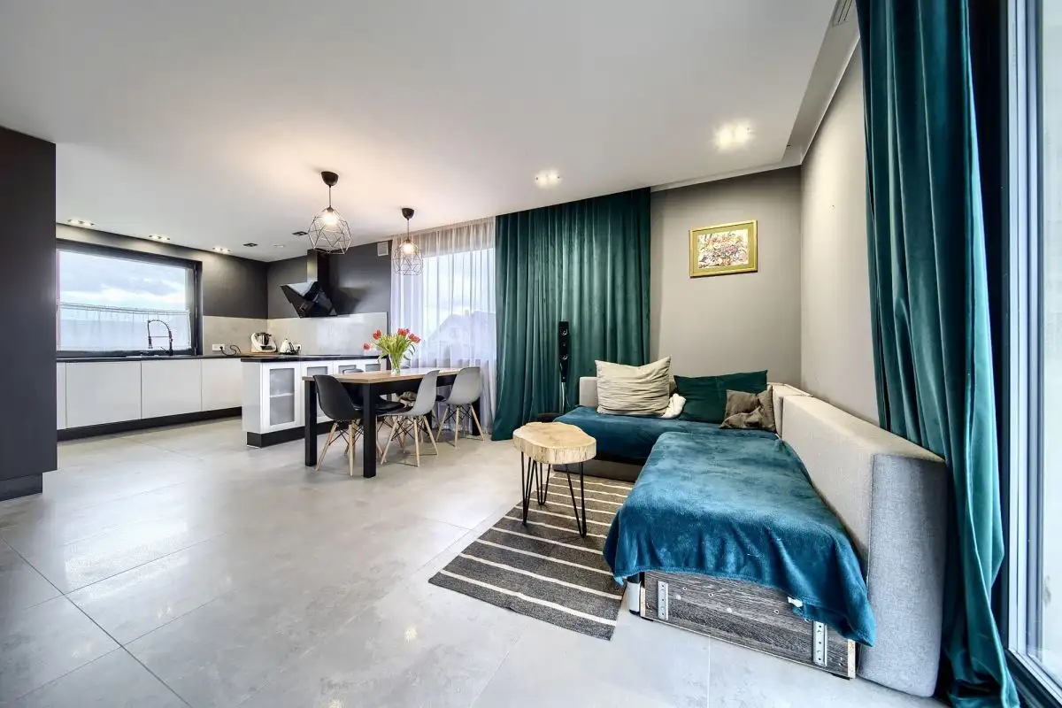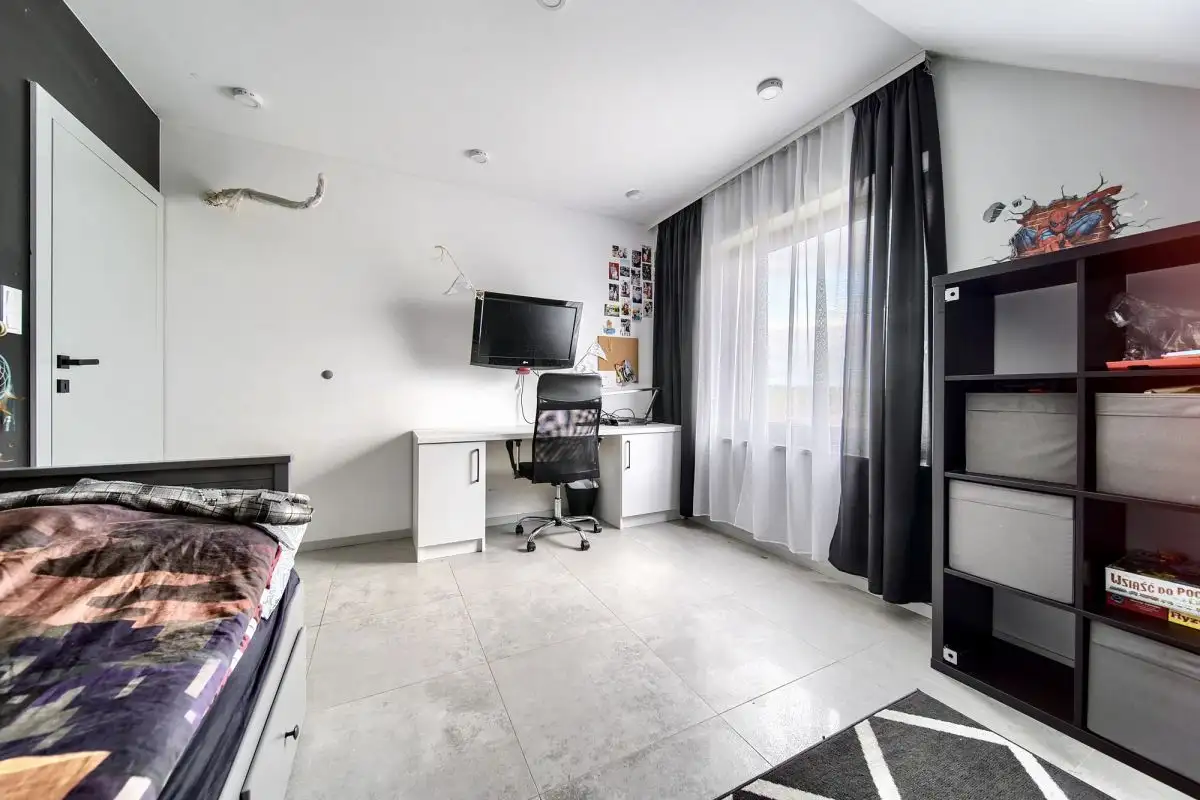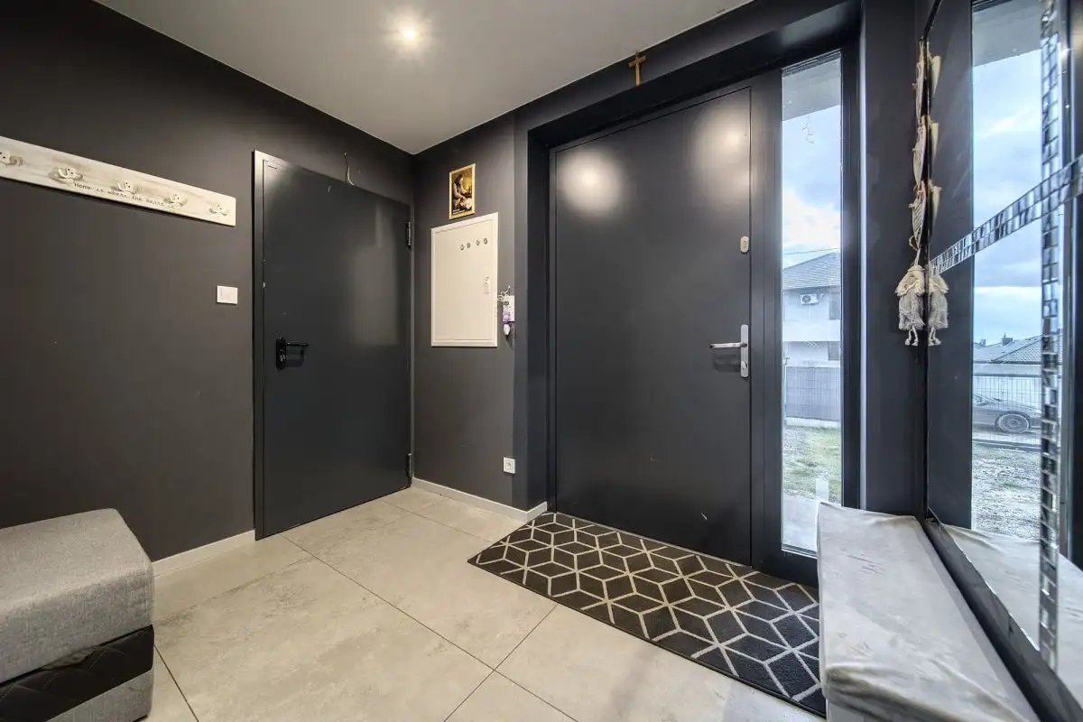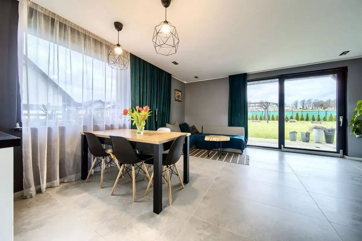 Detale zewnętrzne domu, takie jak duże narożne okna i barwne płaszczyzny, nadają mu nowoczesny i unikalny charakter. Dom jest w pełni wyposażony w meble i sprzęt AGD, co pozwala na natychmiastowe wprowadzenie się i cieszenie się nowym domem bez żadnych dodatkowych nakładów.
